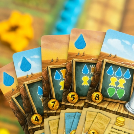 - Добор карт. В урожайный год игроки подбирают по 5 карт из колоды, а в засушливый подбирают сыгранные ими в прошлом году карты.