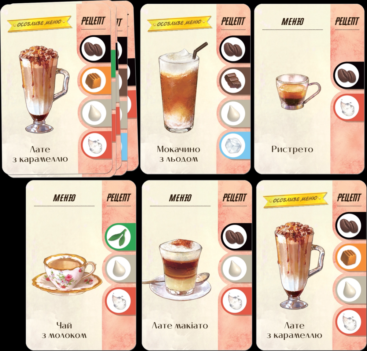 Уже перед началом партии у каждого игрока будет рабочий на поле ресурсов, и соответствующий ингредиент в своей чашке. Первый игрок получает 3 карты заказов, а все остальные игроки – по две.