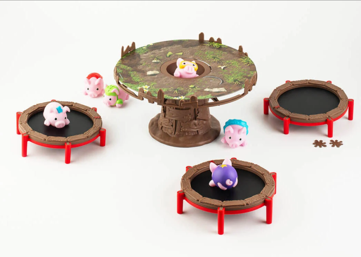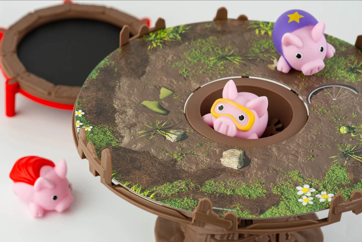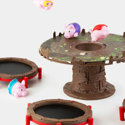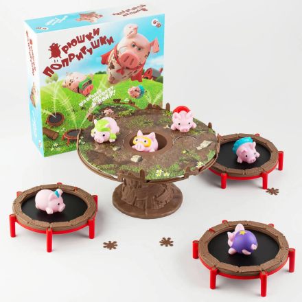 - 2 или 3 игрока получают персональные батуты, с помощью которых поросята смогут прыгать. Главная задача – забросить резиновую игрушку на расположенную в центре стола высокую колокольню с грязью.