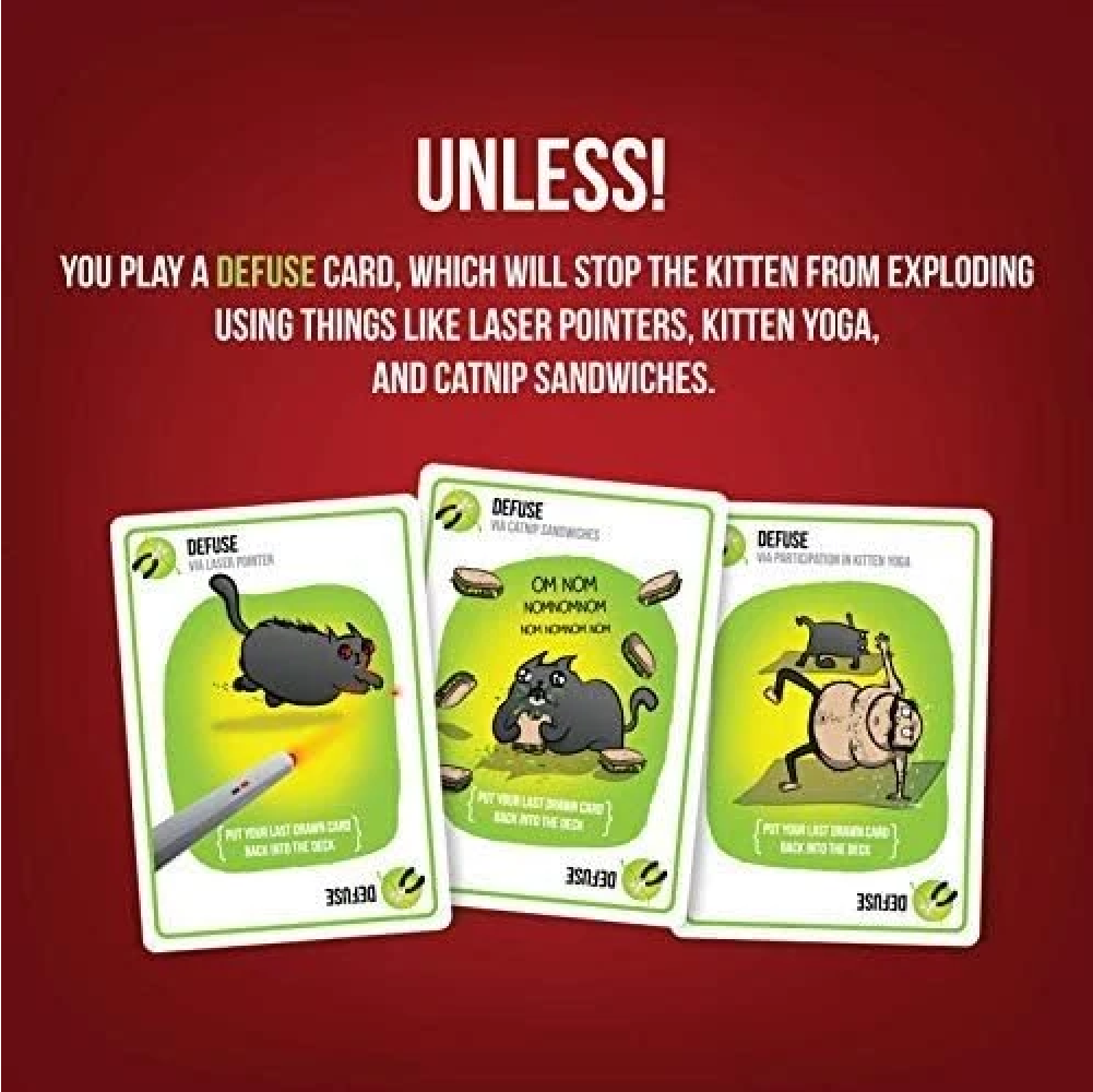 Игра предлагает испытать удачу по методу русской рулетки. Участники по очереди тянут карты, и если кто-то вытаскивает взрывного котенка, он выбывает из игры. Также игроки могут разыграть определенное количество имеющихся на руке карт, среди которых одни могут спасти от взрыва, другие позволят посмотреть на три верхние карты в колоде, прежде чем добирать. Есть и такие, которые дают возможность пропустить ход, заставляют противника добрать несколько карт или вообще крадут у него карту с руки.