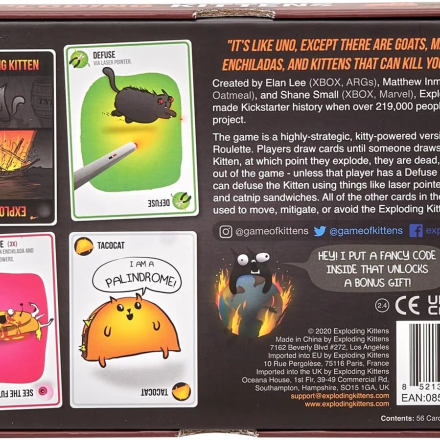 Веселая игра для вечеринок, ставшая необычайно популярной после успешной кампании на «Кикстартере» под названием Exploding Kittens. Игра может похвастаться простым, интуитивно понятным игровым процессом и крайне забавным ироничным сеттингом со взрывающимися милыми котиками.
