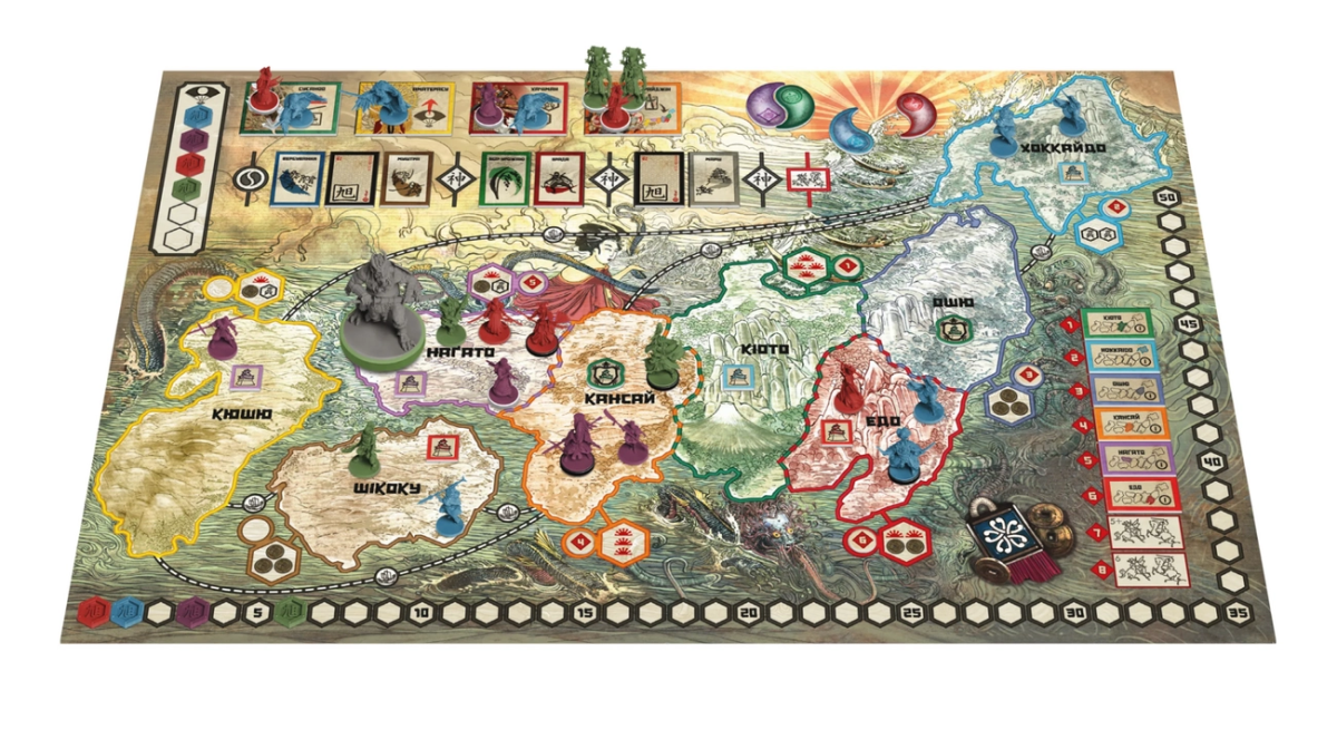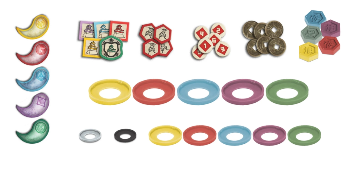 - Сбор: все игроки получают по одной монете, а активный игрок и его союзник получают награду (победные очки, монеты, ронинов) за каждый регион, где у них превосходство в силе;