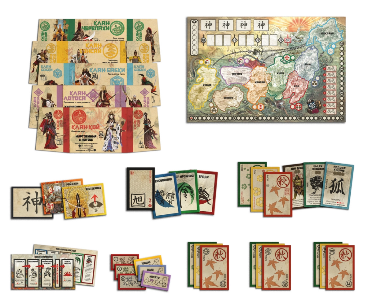 Синто в святилищах, если они имеют превосходство в силе, позволяют воспользоваться даром богов, например, продвинуться по шкале чести, переместить фигурки на поле, получить жетоны ронинов, победные очки, монеты, призвать буси, купить карту времени года и т.д. - В фазу войны происходят битвы в спорных областях, отмеченных военными жетонами.