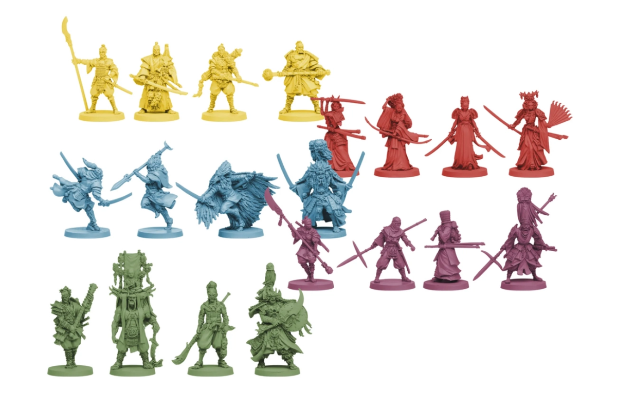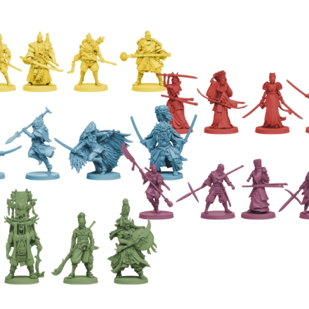 Игроки получают ширмы со всей необходимой информацией и отряды фигурок - военачальника даймё, обычных пехотинцев буси и богомольных воинов синто.