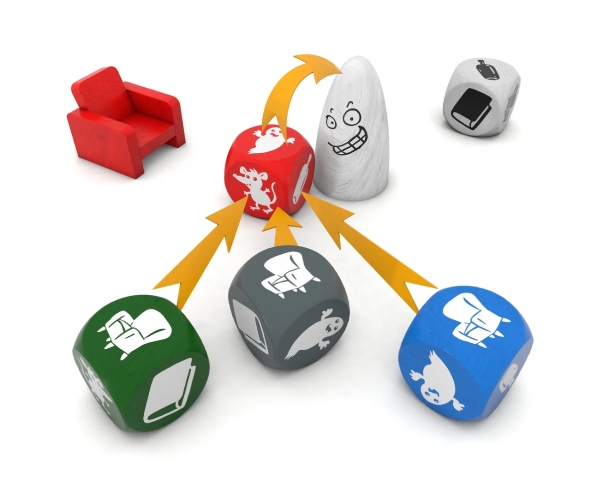 - Один из изображенных на карте предметов полностью, как по форме, так и по цвету, совпадает с одним из пяти лежащих в центре стола предметов. Не задумываясь хватайте этот предмет!