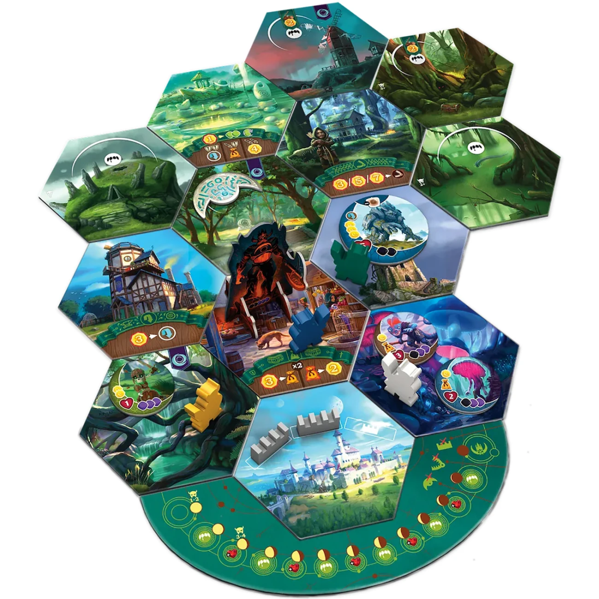 - Битва. Во время встречи на тайле с монстром (малым, большим или Зверем), герой может атаковать, бросив кубики. Количество кубиков монстра указано на его жетоне, а герой всегда бросает два зеленых кубика и несколько дополнительных в зависимости от своей амуниции или эликсиров. После битвы и получения повреждений можно отступить или выполнить еще до двух схваток. Если монстр был побежден – наградой могут быть монеты, новое снаряжение или улучшение снаряжения. Если здоровье героя опускается до 0 – он перемещается на тайл Замка и полностью восстанавливает здоровье, но теряет все монеты и 1 снаряжение по своему выбору.
