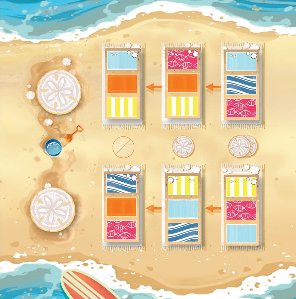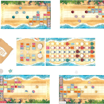 - Каждый игрок получает планшет пляжа и выбирает свой цвет. Он получает все компоненты выбранного цвета: зонтики необходимо случайно разместить в соответствующих ячейках на планшете пляжа вниз, а маркеры ракушки положить на стол рядом со своим планшетом, образовав запас. Кроме того, каждый участник получает по одному жетону песчаного доллара. После этого переверните лицом вверх все жетоны зонтов.