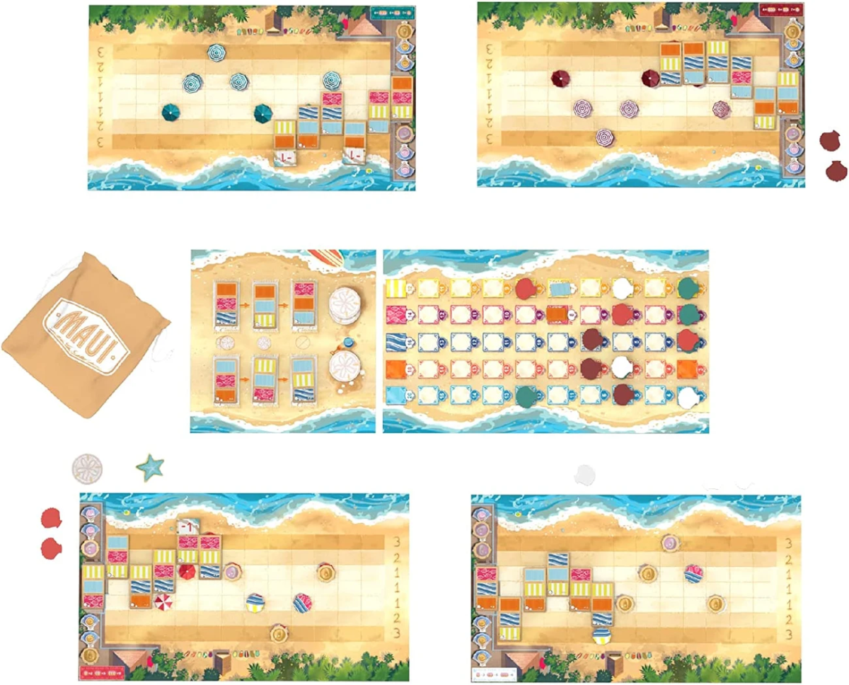 В настольной игре «Мауи» участники перенесутся на белоснежные гавайские пляжи, и будут устраивать полотенца местных жителей и туристов на песочке под тихий шепот волн. «Maui» - это достаточно простая абстрактная стратегия, в которой участникам, однако, все равно придется воспользоваться своей смекалкой и стратегическим мышлением, да еще и испытать удачу с выходом плиток полотенец.