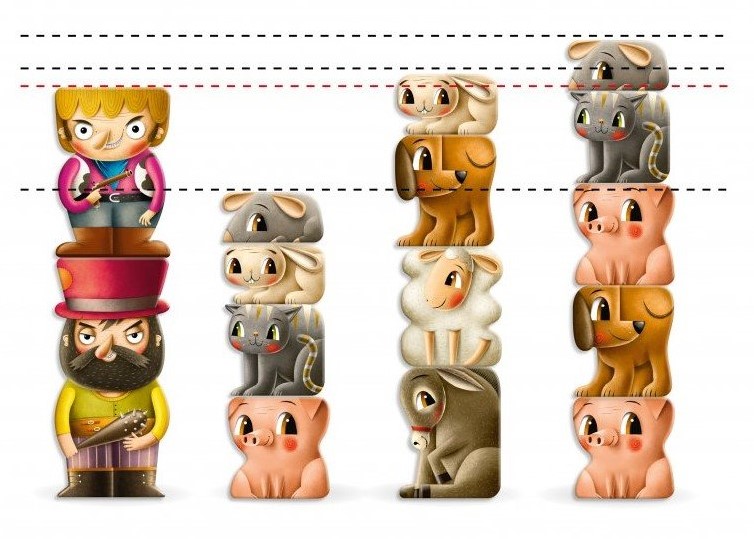 Простая игра на логику и внимание, не так ли? Но стоит помнить: каждое животное имеет свои уникальные свойства, которые нужно учитывать. Например, кот с собакой никогда не будут работать в команде, и если к башне с котом вы положите собаку — кот просто уйдет. Кролики же, наоборот, стараются держаться вместе, поэтому когда вы берете одного кролика — все остальные также перебегают от всех остальных игроков к вам. Свинка приведет за собой из круга своего соседа, овечка — любого другого друга. И ни в коем случае не заканчивайте игру с ослом сверху — его просто никто не испугается! Попробуйте подружить с собой всех ваших животных и построить крепкую команду именно такой высоты, что сможет победить!