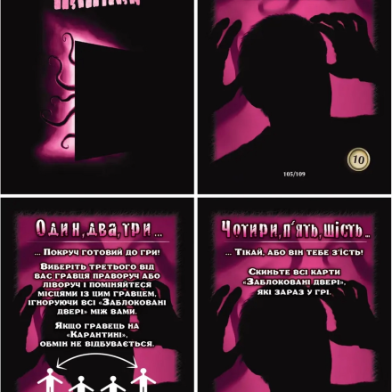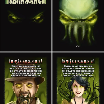 - Заражение - если вы вытаскиваете или получаете от соседа такую карту, вы сразу становитесь на сторону зла, и отныне должны либо избавиться от всех незараженных, либо вызвать их заражение. Карту заражения может передать соседу только что-то, но одновременно эту карту нельзя сбрасывать. Вы никогда не можете избавиться от последней карты заражения, однако если вы получите вторую, третью или даже больше таких карт, вы можете передавать их что-то (и только ему).