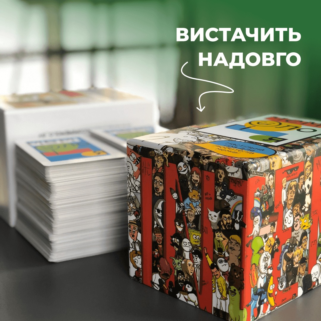 - Ведущий достает из общей стопки карту с мемом и выкладывает перед всеми.