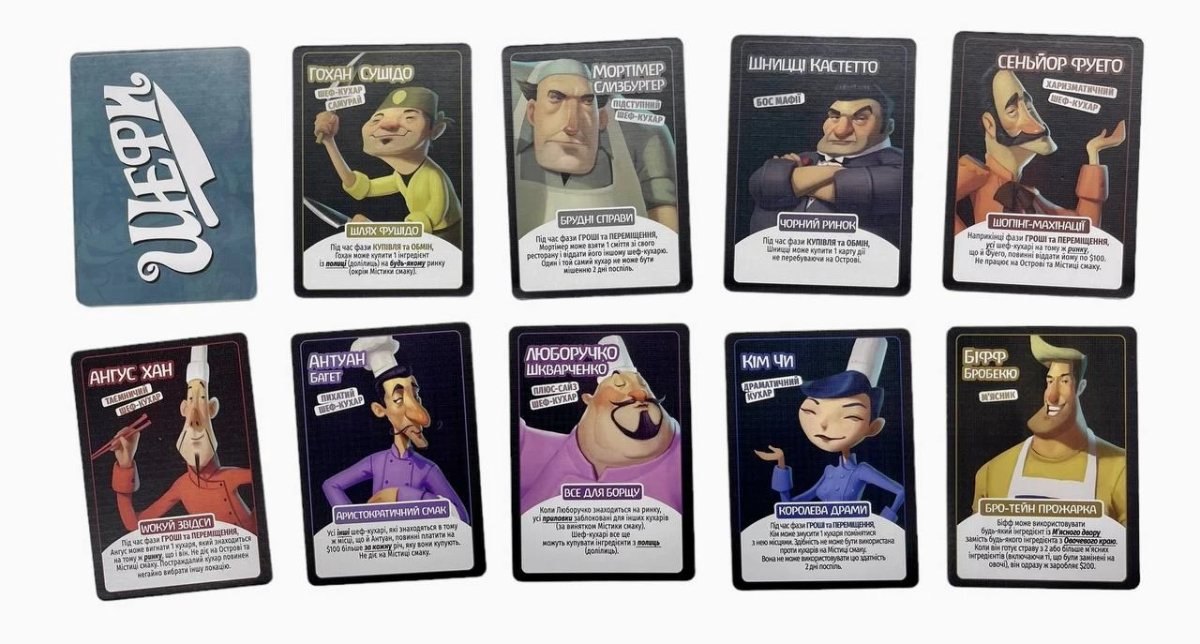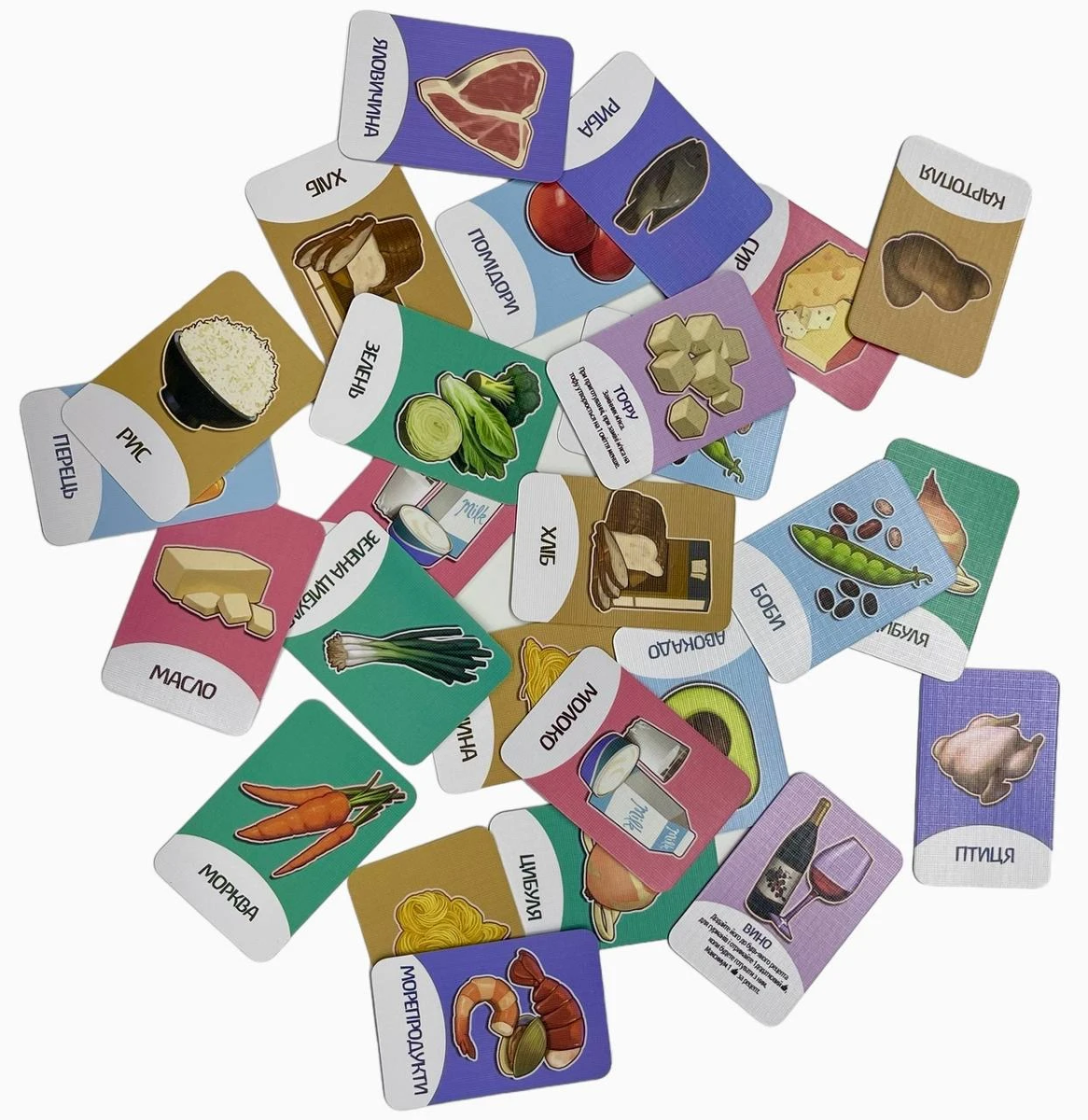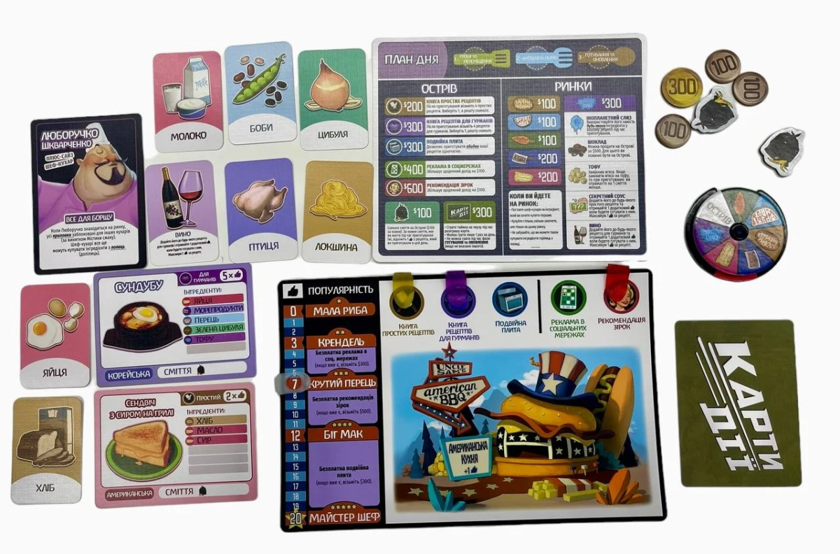 - покупайте карты с прилавков и полок, а также обменивайтесь ингредиентами, рецептами, картами действий, улучшениями, услугами или мусором с другими поварами,