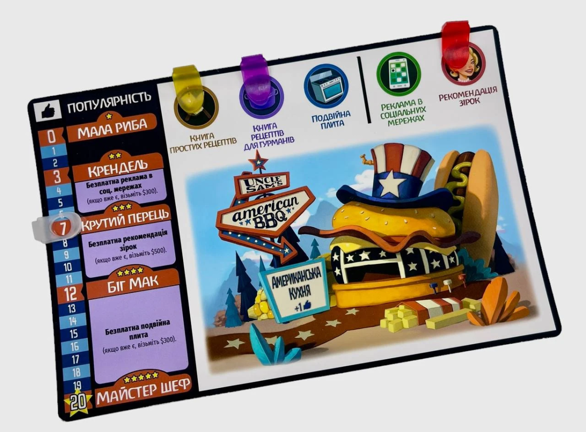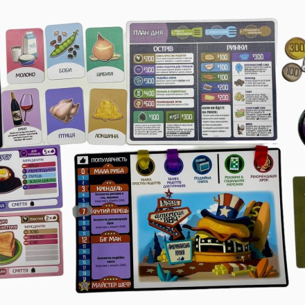 - готовьте рецепты, засчитайте очки популярности или штрафы за мусор, получите жетоны мусора и новый рецепт, после чего обновите запасы на прилавках рынков.