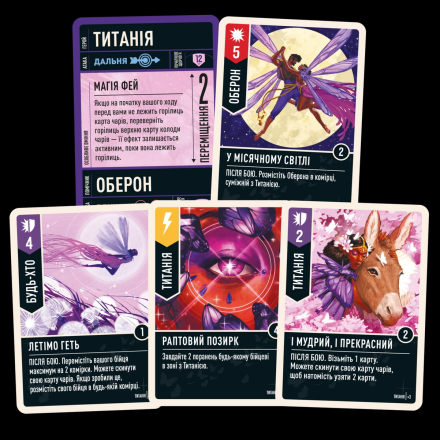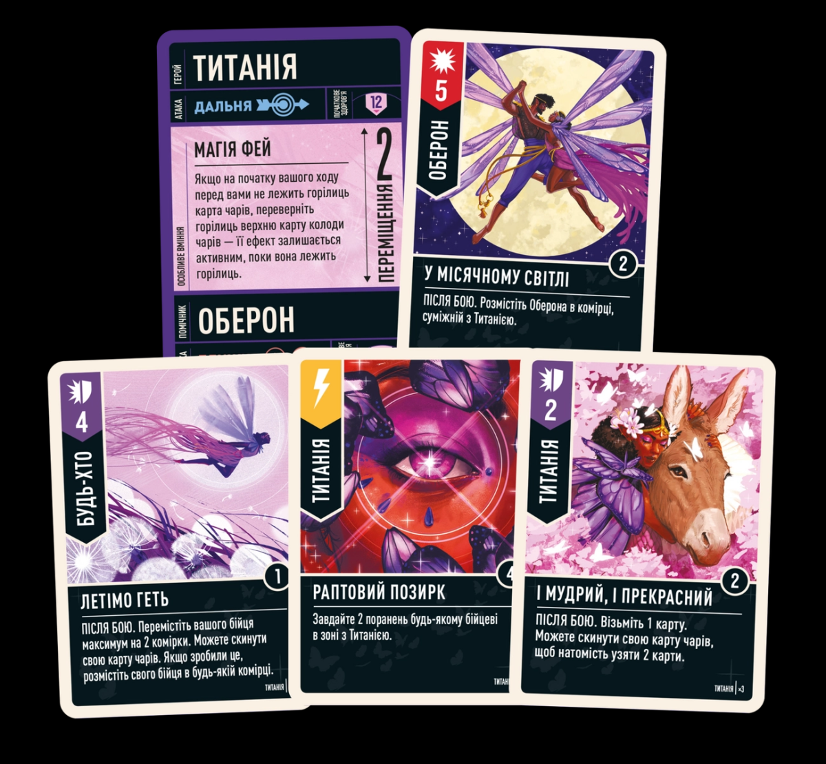 - Титания. Королева фей обладает мощным волшебством. Титания использует колоду из шести карт волшебства, каждая из которых имеет определенный эффект. В начале хода, если перед вами нет активной карты волшебства, откройте верхнюю карту из колоды волшебства. Она будет активной, пока лежит лицом вверх на своем месте. Вы можете сбросить активную карту волшебства с помощью некоторых эффектов карт действий. Однако когда карты волшебства исчерпаются, вы не сможете образовать новую колоду из сброса. Но некоторые эффекты карт действий позволят вернуть волшебство в колоду.