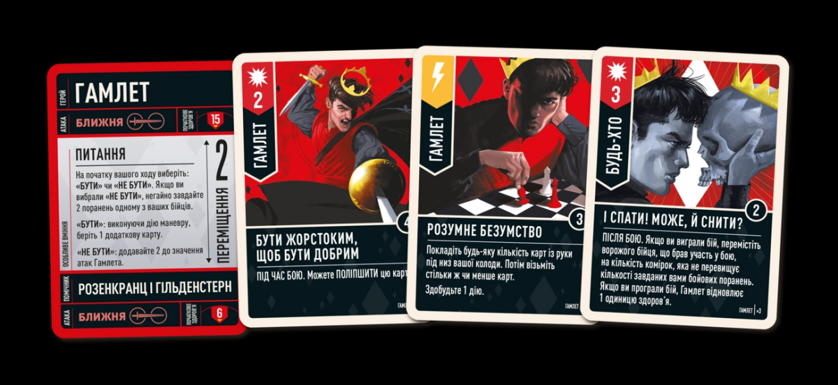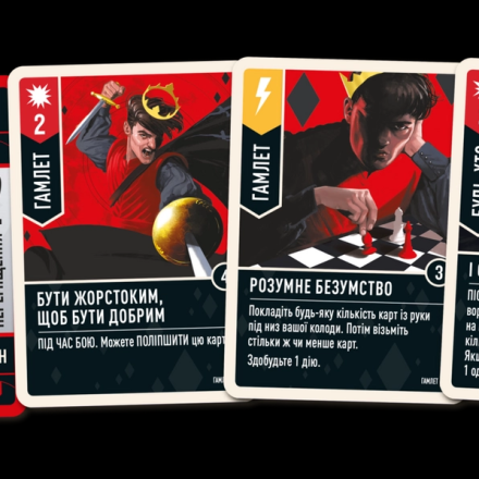 - Гамлет. Быть или не быть? Вопрос, вечно загоняющий принца в тупик. В начале каждого хода выберите, какой стороной вверх будет лежать жетон – «быть» или «не быть». Пока на жетоне «быть», каждый раз при маневре берите одну дополнительную карту. Когда выбираете «не быть», вы должны немедленно нанести два ранения одному из ваших бойцов, однако значения всех атак Гамлета будут иметь +2.