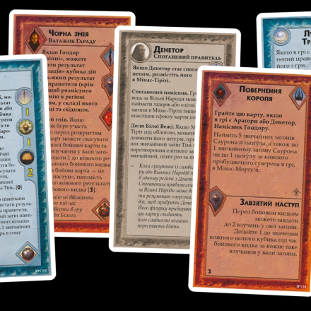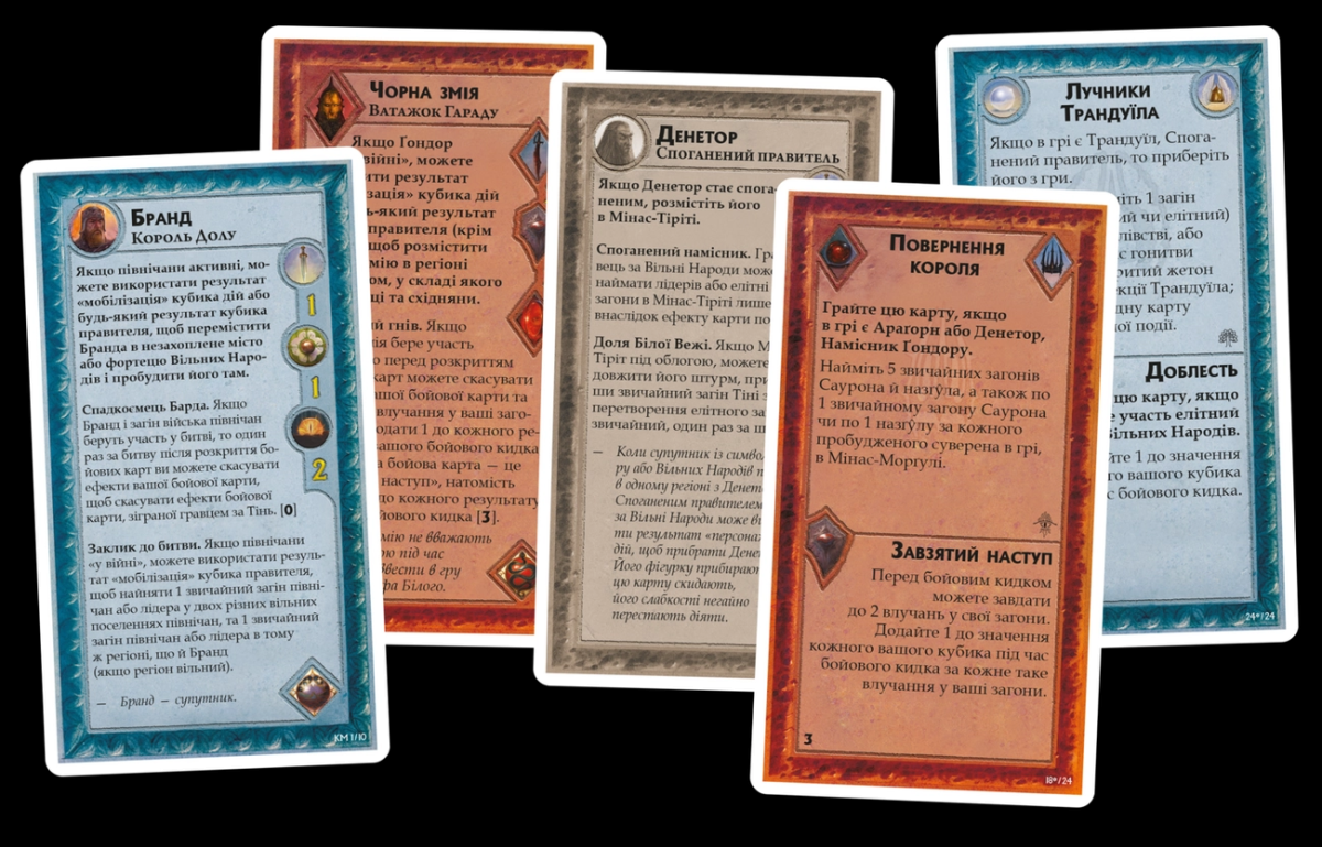 - Особые боевые умения правителей. Бранд, Теоден и каждый из темных вожаков имеют по одному особому умению, которое можно использовать в бою. Активация большинства из этих умений требует от игрока пожертвовать эффектами боевой карты (впрочем, условия для разыгрывания боевой карты должны быть соблюдены);