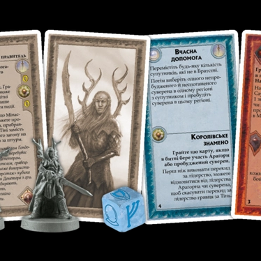 - Кубики правителей. Играя с дополнением «Короли Средиземья», каждый игрок получает особый кубик действий правителя. Голубой кубик для игрока за Свободные Народы и коричневый кубик для игрока за Тень. На кубиках правителей те же символы, что и на обычных кубиках действий, но они используются по особым правилам;