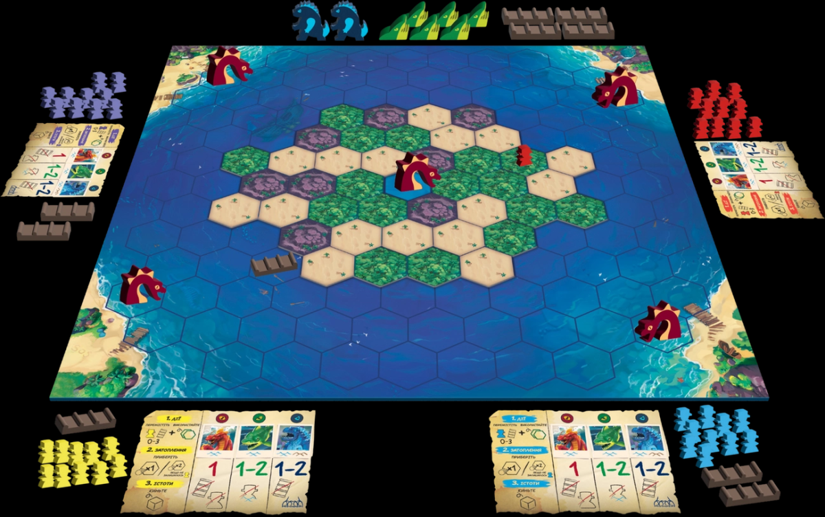 - В фазе подготовки игроки по очереди будут выставлять фигурки исследователей на свободных ячейках острова, пока не выставят всех. Каждая фигурка имеет свою ценность, и она неизвестна соперникам. После фигурок на морские гексы у побережья выставляются по 2 лодки каждого участника игры.