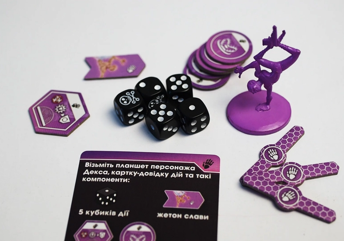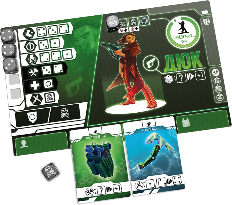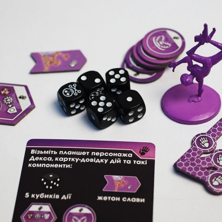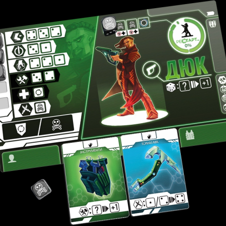 - Фаза действий: назначение кубиков на планшете и карточках снаряжения, выполнение свободных действий и действий персонажа.
