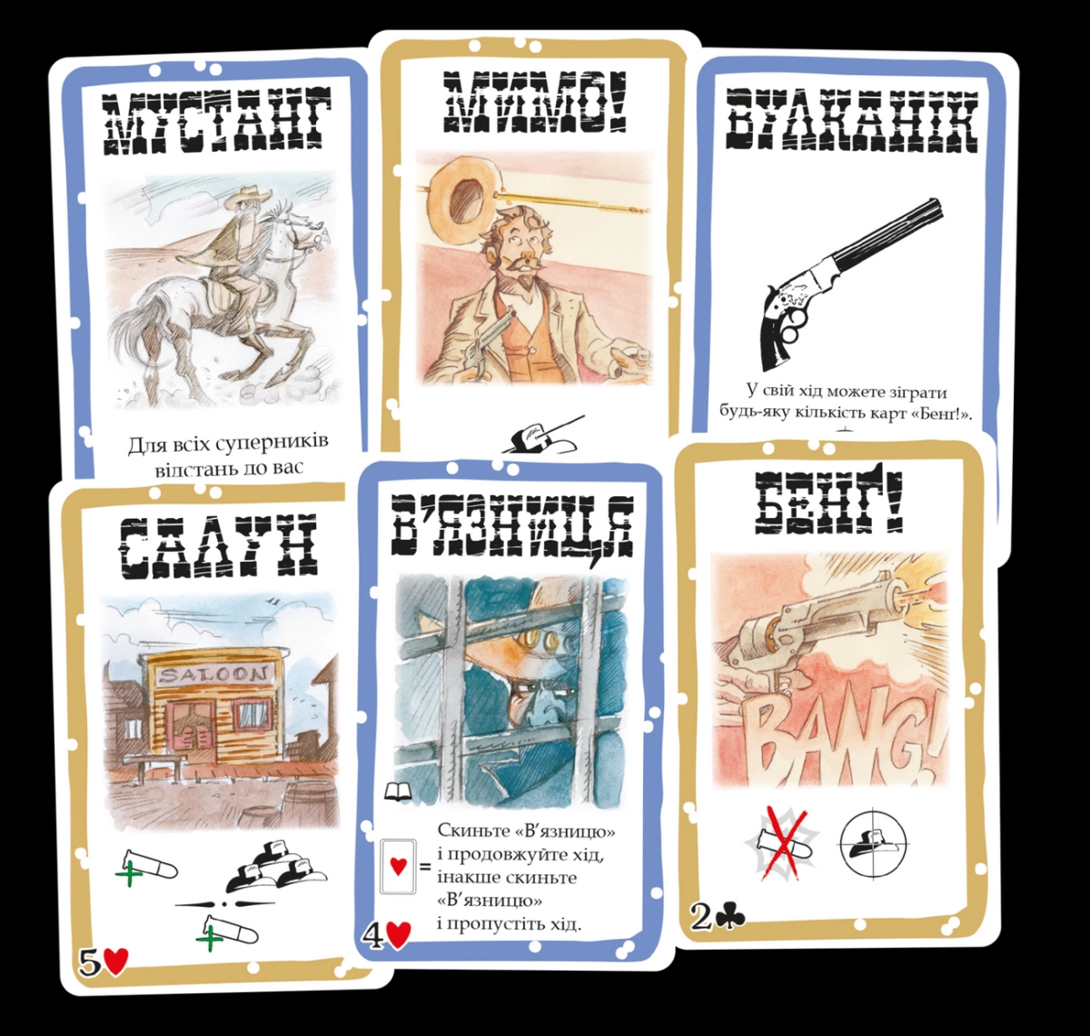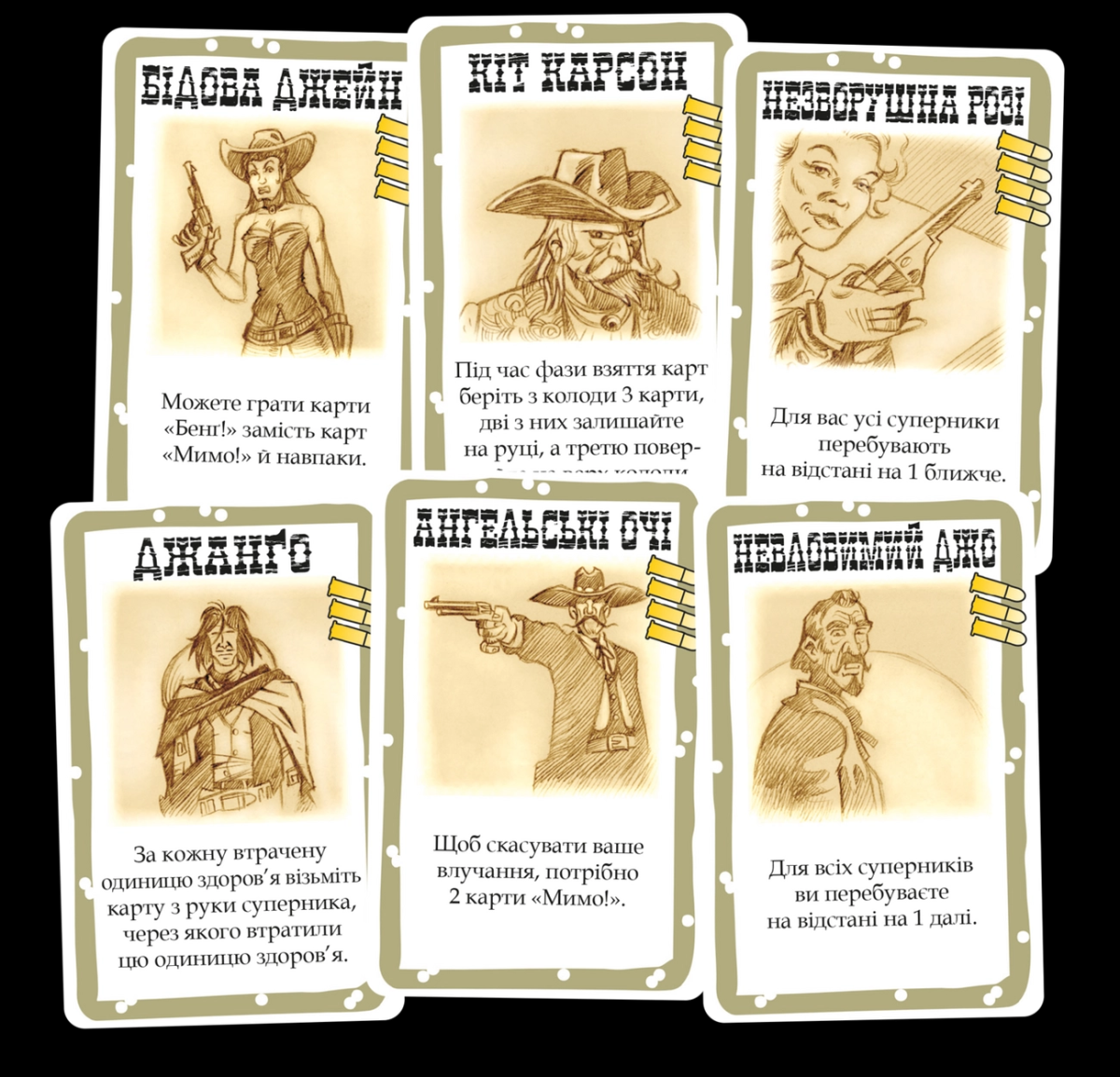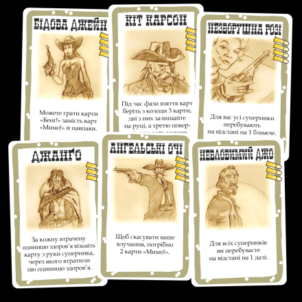 Все участники игры, помимо ролей, дополнительно получают персонажей с уникальными способностями. Это известные обитатели Дикого Запада – Джанго, Неуловимый Джо, Малыш Билли и другие литературные и кинематографические герои. Перестрелка начинается практически с первых ходов. Бандиты уже могут приниматься за шерифа, атакуя его карточками «Бэнг!», а тот увертываться от выстрелов с помощью карточек «Мимо!». Кто-то будет осторожно прощупывать почву, кто-то бросится объявлять дуэли, раскрыв свои намерения. Как и в «Манчкине», у игроков есть возможность усилиться, выбрав оружие получше, увеличив или уменьшив расстояние к сопернику и т.д. Чтобы не умереть от болевого шока, полученные раны можно излечить с помощью пива. Также в игре есть возможность запустить по кругу динамит!