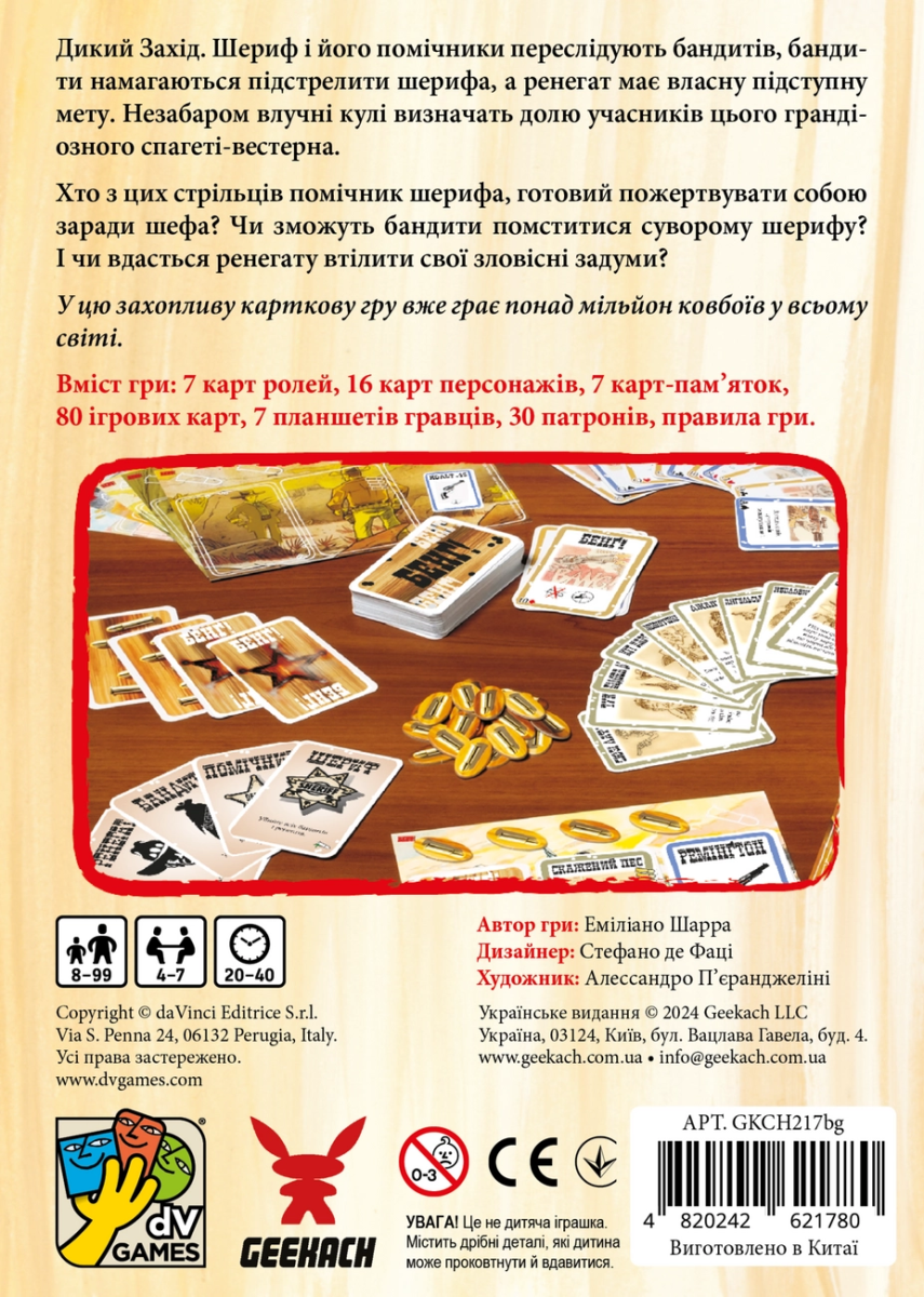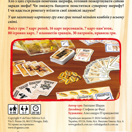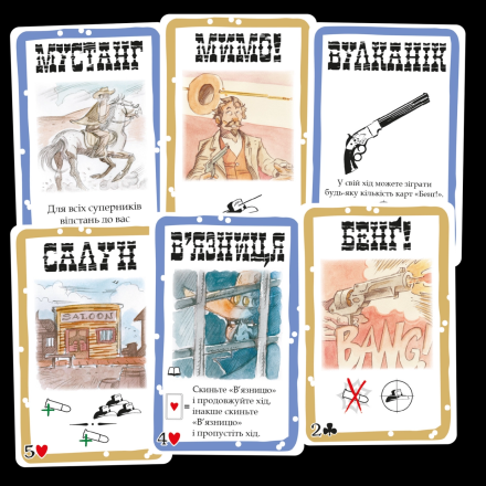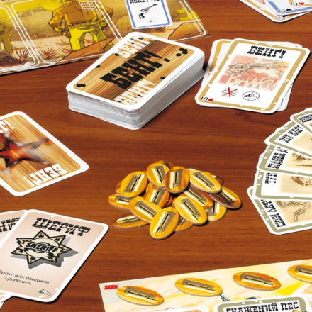 «Бэнг!» – это культовая карточная игра-перестрелка для большой компании, которая взяла лучшее от популярной «Мафии» и знаменитого «Манчкина». Подобно «Мафии» игрокам достаются роли: шерифа, помощника шерифа, нескольких бандитов и ренегата. Шериф сразу открывает свою карту, роли остальных участников остаются в тайне, а их задачи принципиально отличаются. Например, бандиты должны убить шерифа, помощник шерифа старается помешать им, защитив своего шефа, а ренегат отыгрывает, пожалуй, самую сложную роль – поскольку ему нужно остаться последним выжившим, до поры до времени он защищает шерифа, выдавая себя за помощника, а в конце игры, если ему удастся продержаться, он предательски стреляет шерифу в спину.