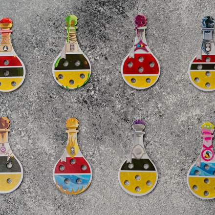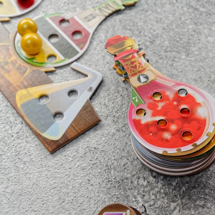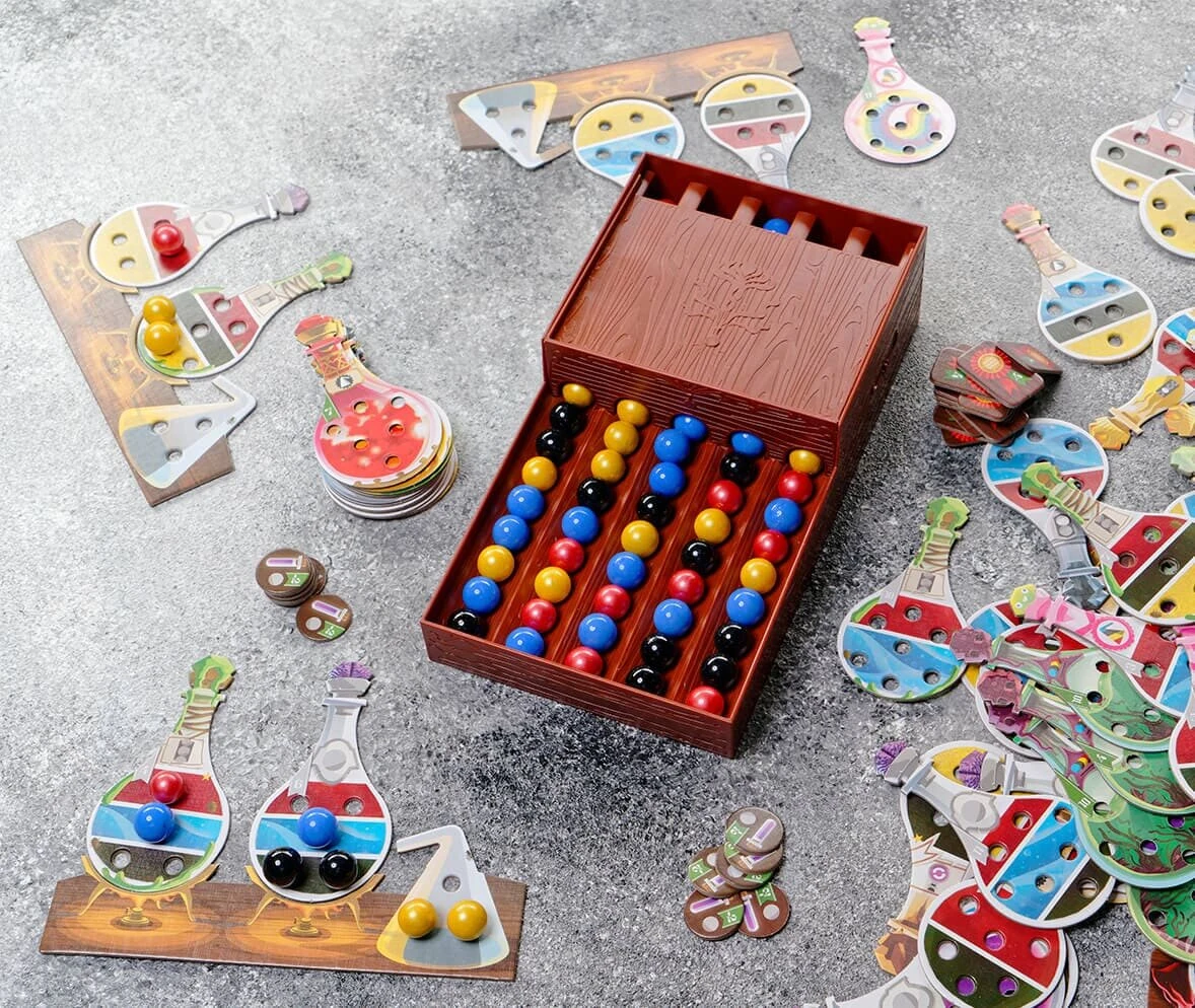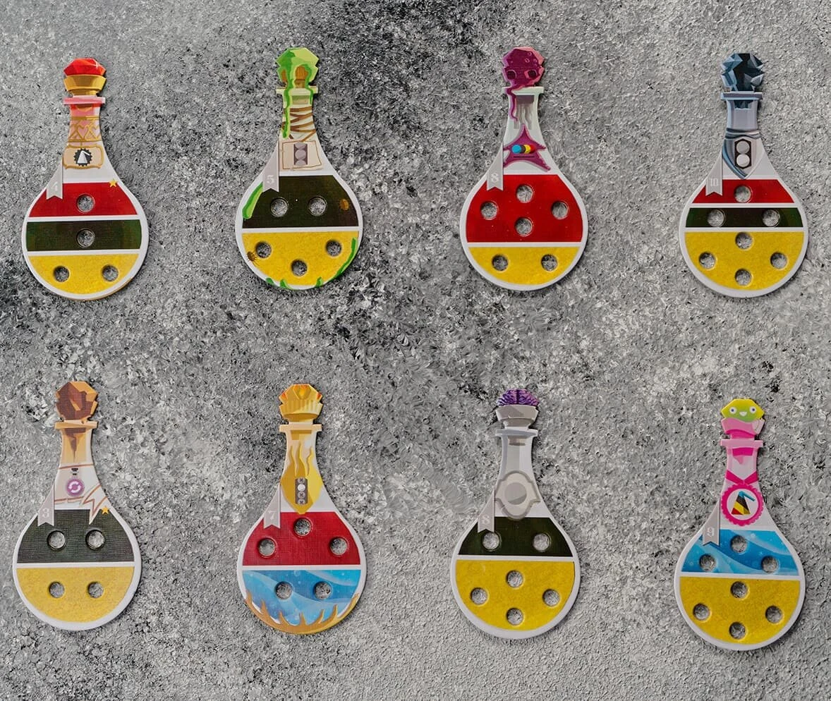 Полученные шарики размещаются на отверстиях то же цвета в колбах или отправляются в запас на планшете, где есть три дополнительных места. Если колба полностью заполнена шариками необходимого цвета, зелье считается сваренным. Все шарики возвращаются обратно в дозатор, а колба переворачивается и помещается в зону готовых зелий. Сваренное зелье принесет указанное на нем количество победных очков в конце игры. Также его можно выпить в любой момент хода, чтобы активировать магический эффект, например, получить один шарик из дозатора, украсть ингредиенты у товарища, произвести манипуляции с шариками на дорожках дозатора или разместить шарики в колбах, не обращая внимания на их цвет.