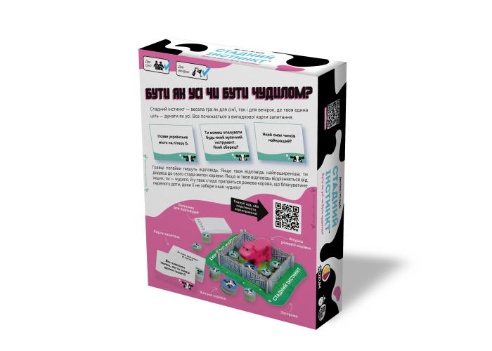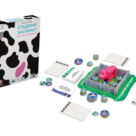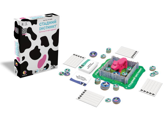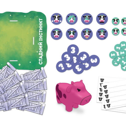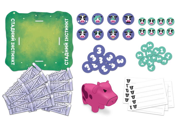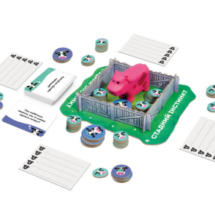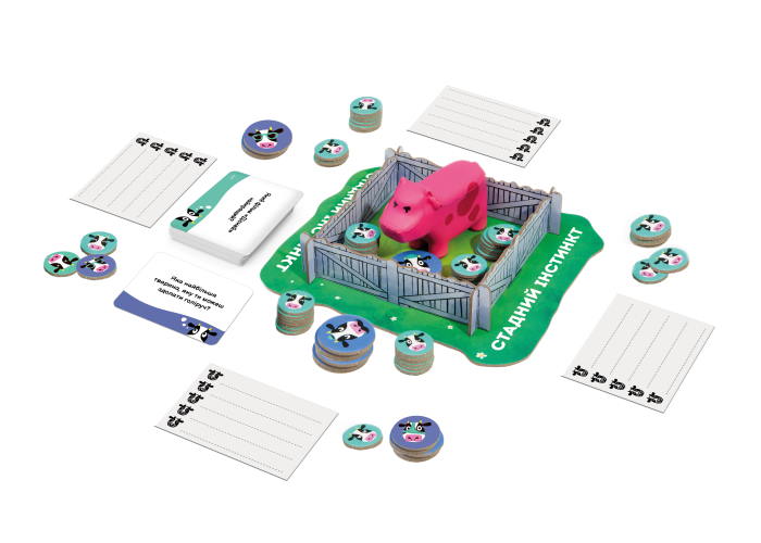 Игровое поле образует изгородь с жетонами коровок и мягкой розовой фигуркой внутри. Игрокам понадобятся карандаши и листы, вот и все – игра началась.