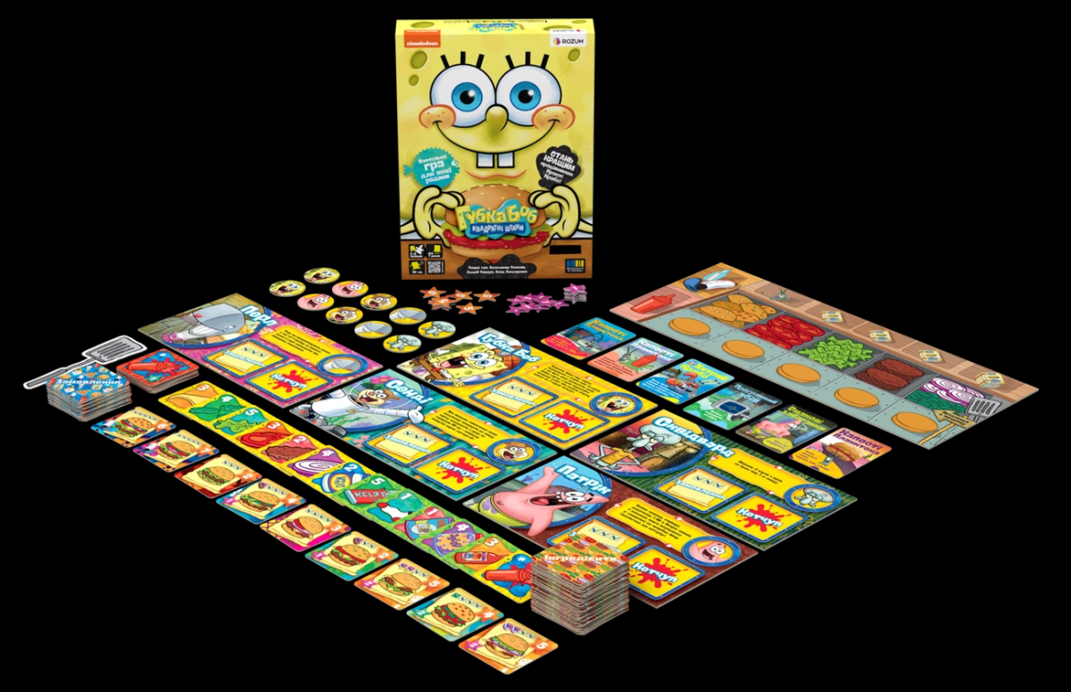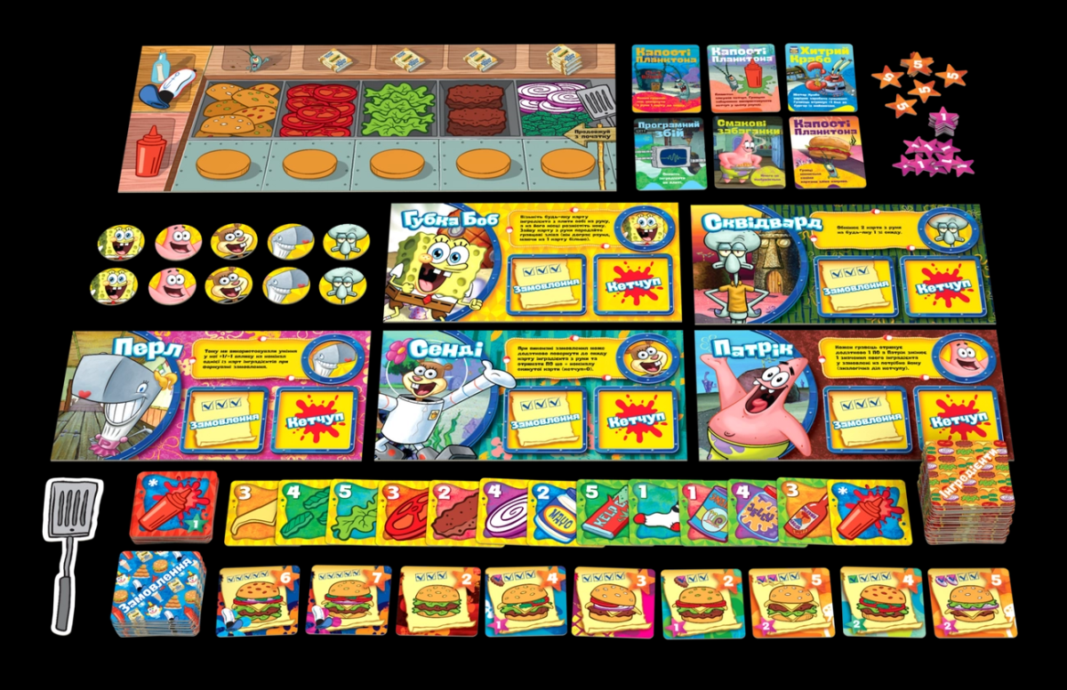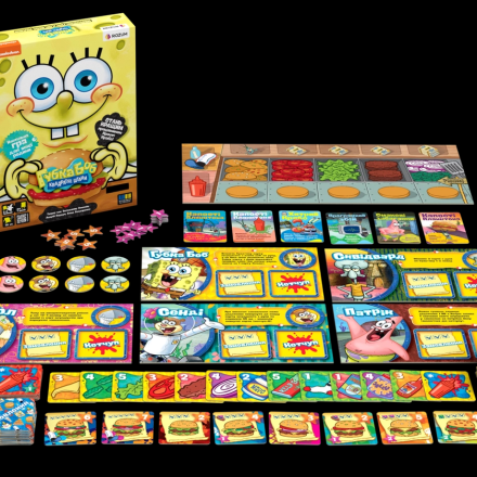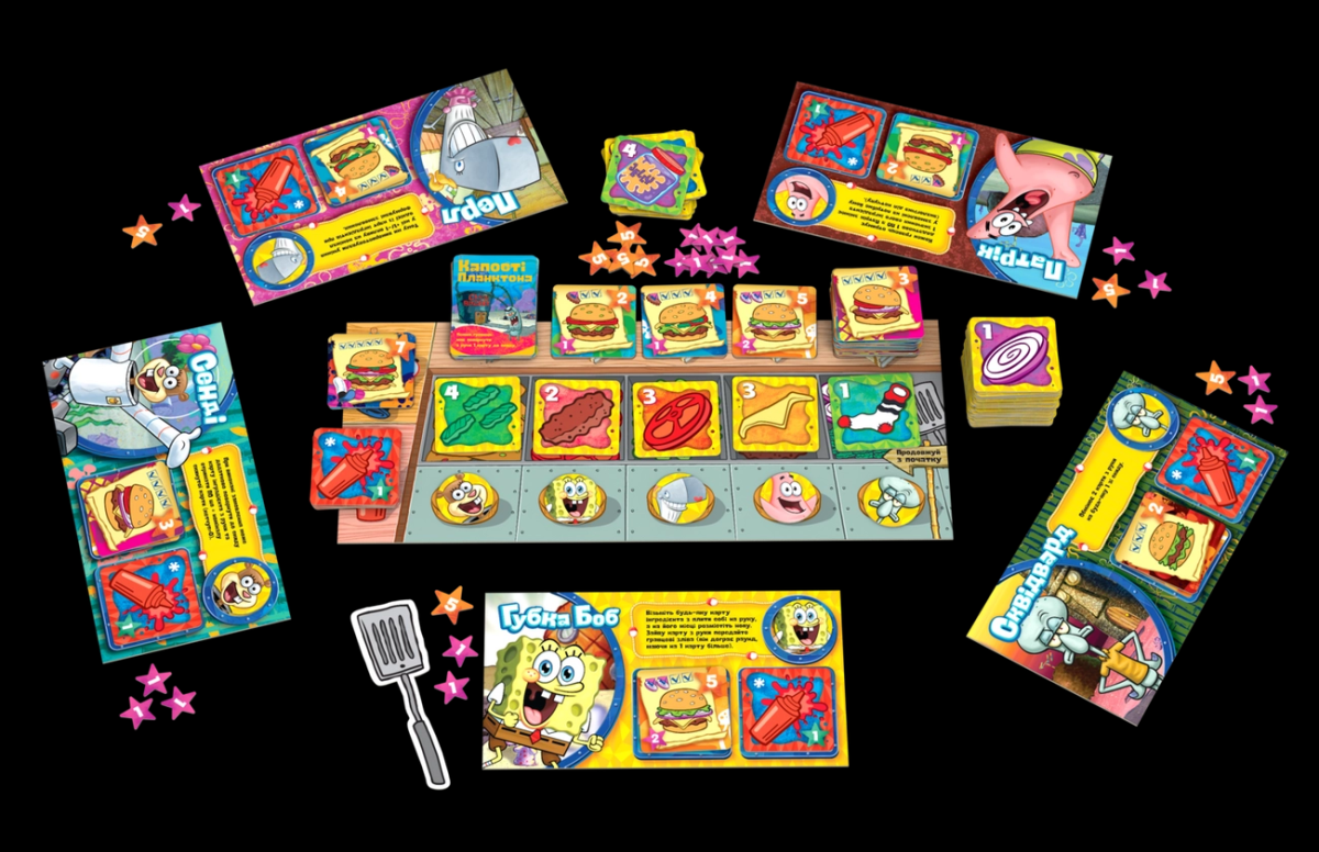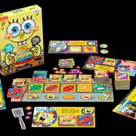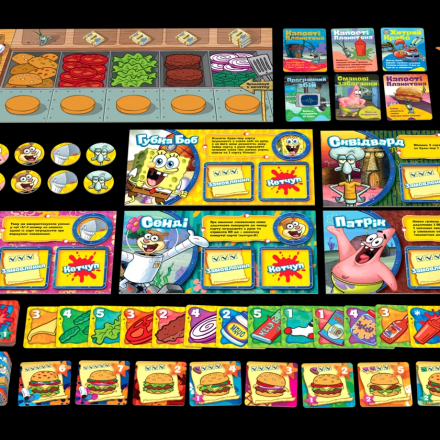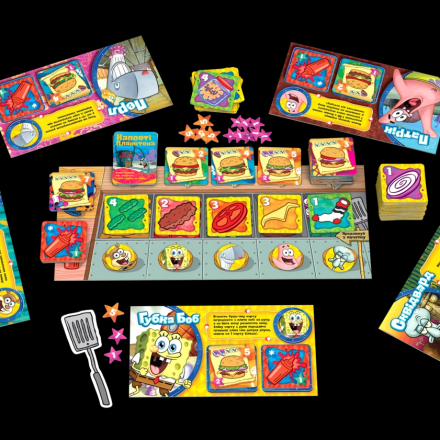 - Фаза подготовки.Игроки по очереди подбирают до трех карт ингредиентов из бревна и открывают карту пакости Планктона. Карта пакости вводит особое правило на текущий раунд, поэтому игрокам нужно спланировать свои действия под новые условия.
