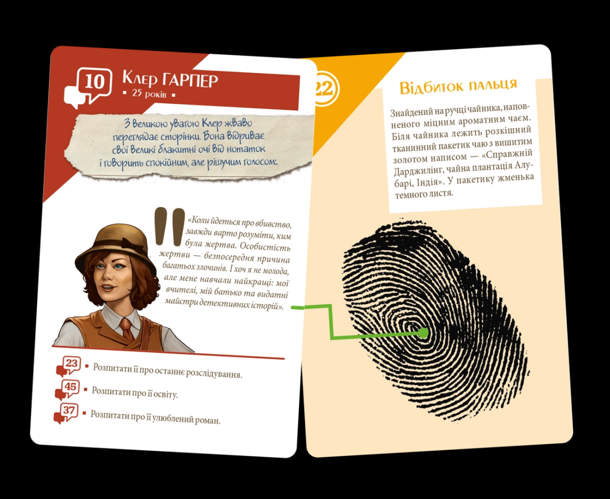 В течение игры вы будете читать карты доказательств, обсуждать полученную информацию, делать предположения и определенные выводы. Ваша цель – получить как можно больше очков, правильно ответив на вопросы.