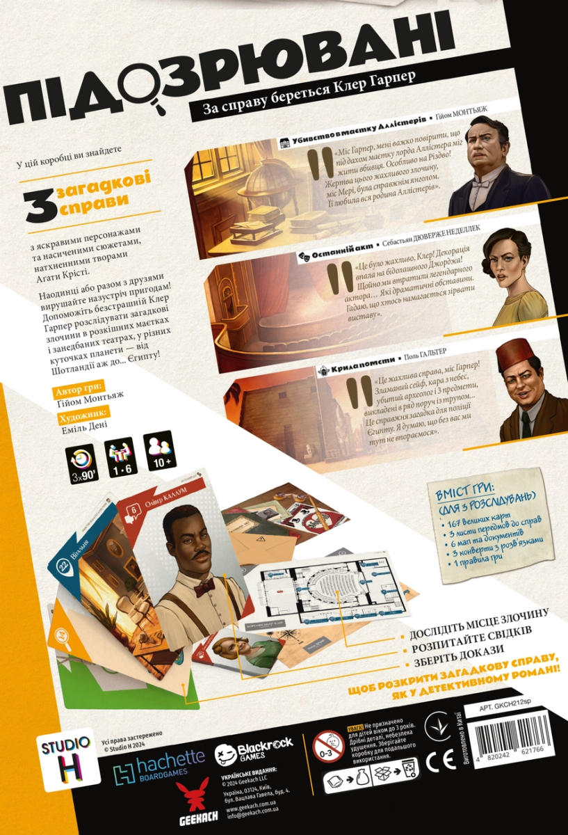 «Подозреваемые» – это детективная кооперативная (или же соло) игра, которая предлагает участникам расследовать загадочные дела с яркими персонажами и насыщенными сюжетами, вдохновленными классическими детективами Агаты Кристи. Вы будете играть за Клэр Харпер – молодую детективку, которая раскрывает запутанные преступления 1930-х годов в разных уголках мира.