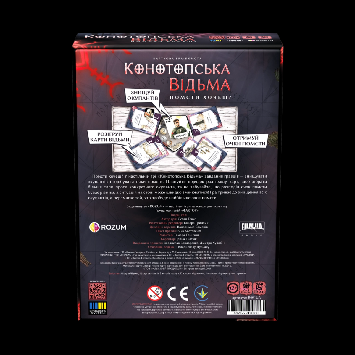 «Конотопская ведьма» – быстрая карточная игра, в которой игроки освобождают земли от захватчиков. Ищите лучшие комбинации эффектов карт, тщательно планируйте свои ходы и вершите правосудие.