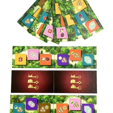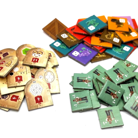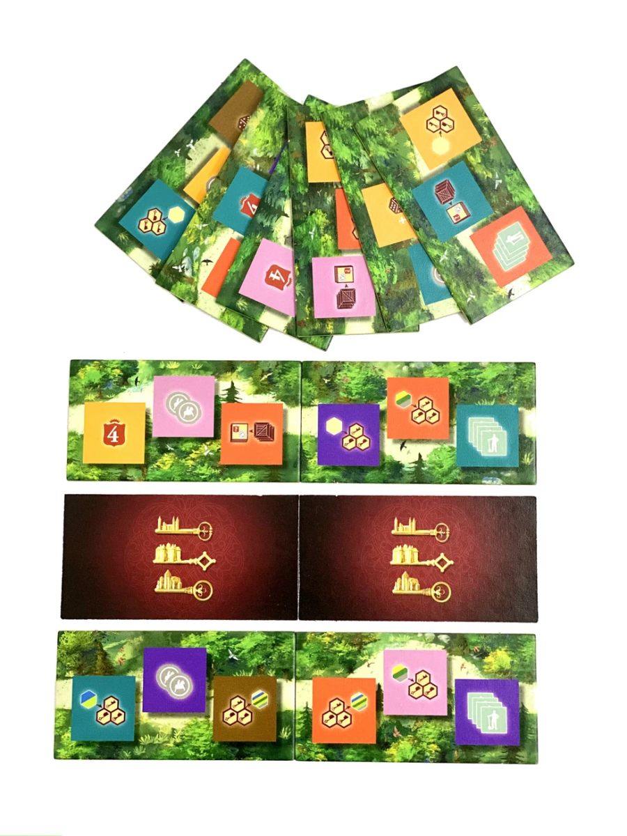 Синие тайлы кораблей позволяют забрать все товары из любого хранилища и продвинуться по шкале очередности хода. Животноводческие салатовые тайлы приносят столько победных очков, сколько животных изображено на них. Темно-зеленые замки дают дополнительное действие. Рудники приносят серебряные самородки. Бежевые жетоны зданий позволяют продавать товары, получать новые тайлы, самородки, рабочих и т.д. Желтые гексы знаний дают определенные бонусы в процессе партии и приносят победные очки в конце игры.