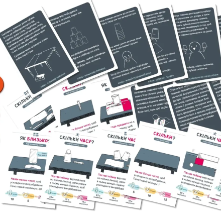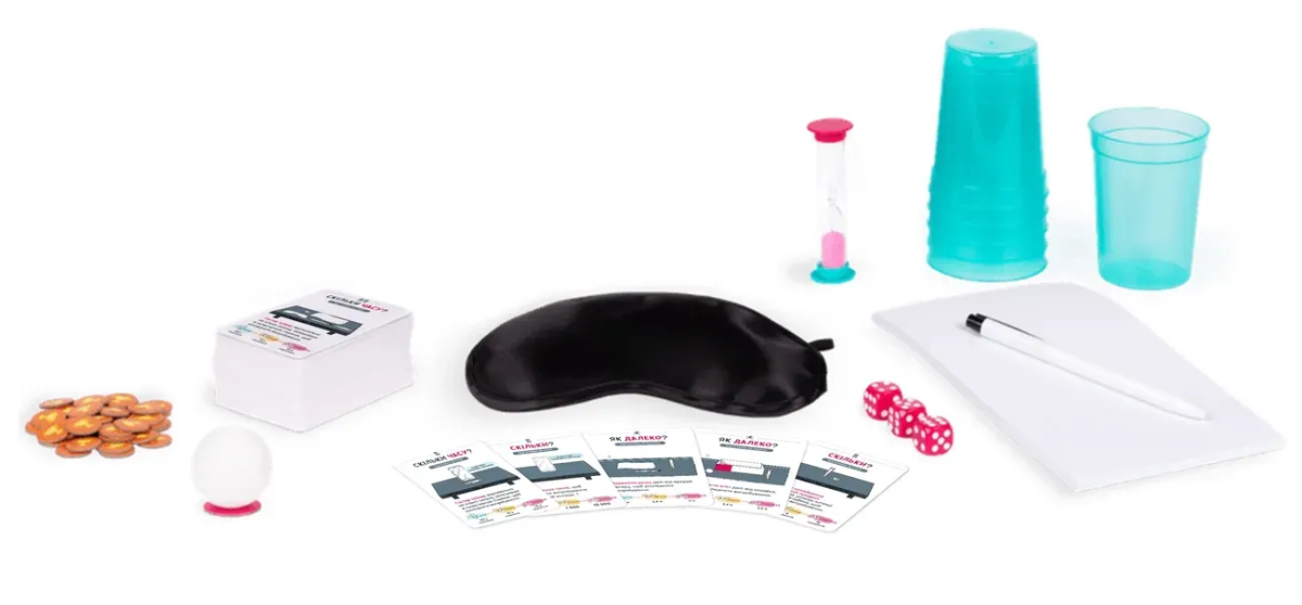 В игре есть 150 задач, для которых используются реквизиты, например повязка на глаза, чашки и мячики, кубики, ручки и прочее — все это входит в комплект.