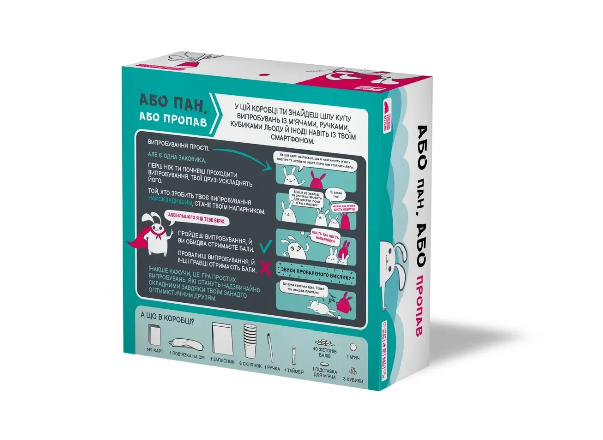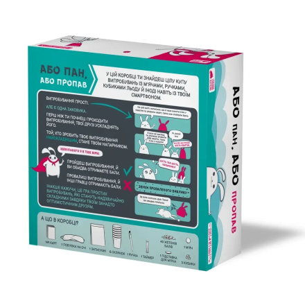 «Или пан, или пропал» — безумный творческий патигейм на ловкость. В центре игры — храбрец, которому предстоит пройти испытание, щедро усложненное его «напарником». Именно тот, кто придумает для тебя жесточайшие условия, и станет твоим союзником — разделяя с тобой либо триумф, либо поражение. Но в случае провала — ни стыда! Просто твой друг… чуть-чуть переоценил твои возможности. Из любви, конечно. Это веселая игра, в которой нужны смелость, смекалка и хороший запас рокового оптимизма.
