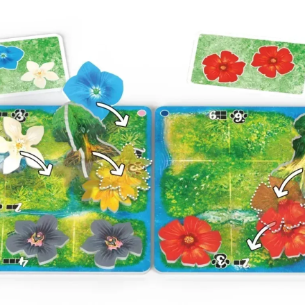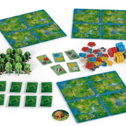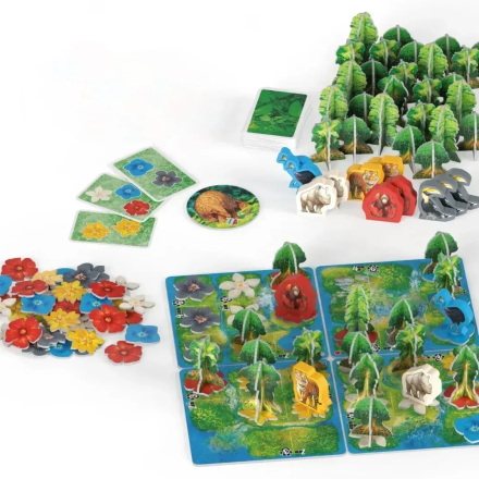 Каждый игрок получает в свои владения 4 клочка земли — планшеты тропического леса. Их можно соединить любым образом. Далее выкладываются 9 стопок с картами цветов — по 1 стопке на раунд — и жетоны цветов, деревья и животные. Первый игрок выполняет следующие действия: