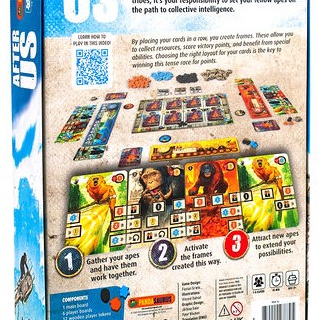 На планету Земля таки упала тень всеобъемлющей катастрофы. Человечество истреблено, но некоторые жители планеты все же продолжают развиваться. Счастливую жизнь еще возможно воссоздать! Сделайте это вместе с различными видами обезьян в игре «После нас»! Это колодостроительная карточная игра для 1-6 игроков на управление ресурсами. Узнали этот арт? Это же талантливый и мастеровитый Венсан Дютре — дизайнер таких игр как «Ольтре» та «Племена ветра». Поспешите! Будущее зависит от вас!