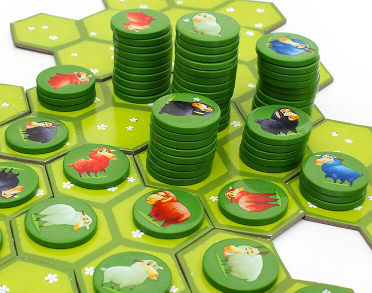 Пастбище формируется поочередно – игроки выкладывают по одному тайлу так, чтобы каждый новый элемент прилегал хотя бы одной стороной к уже размещенным. Когда поле готово, игроки выставляют свои стопки овец на любые шестиугольники по краю пастбища.
