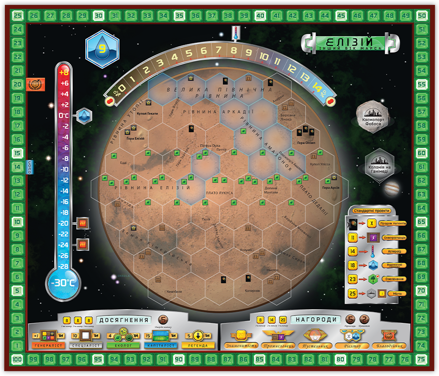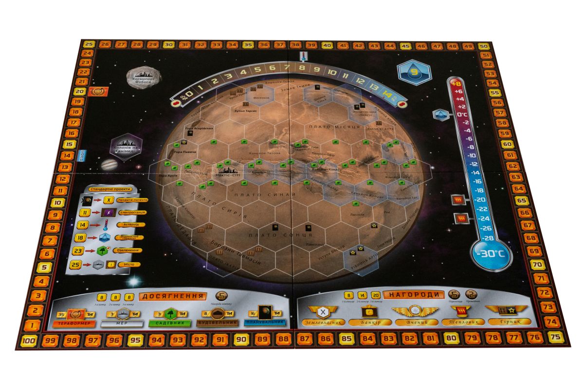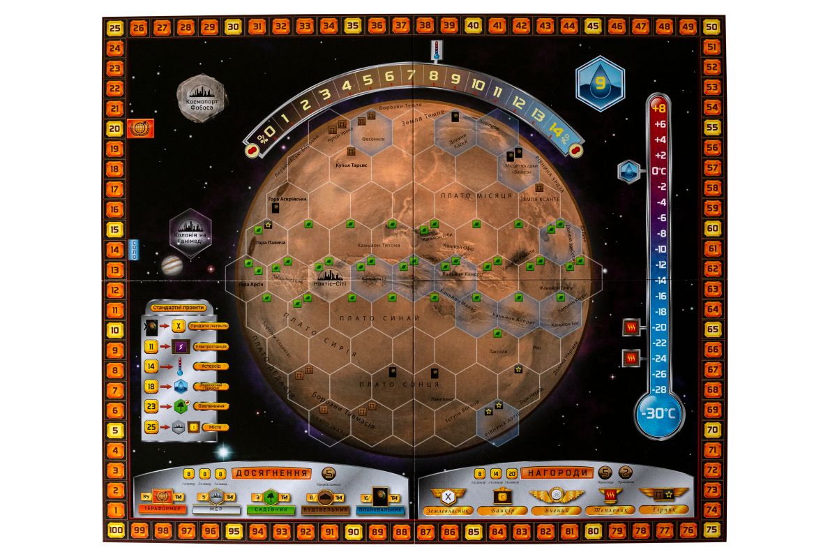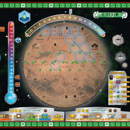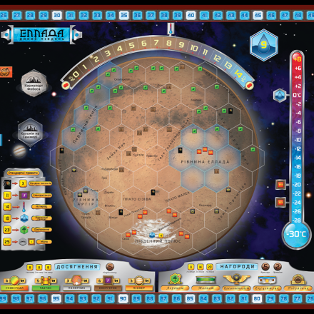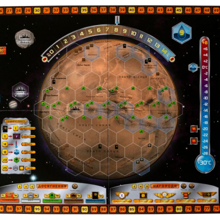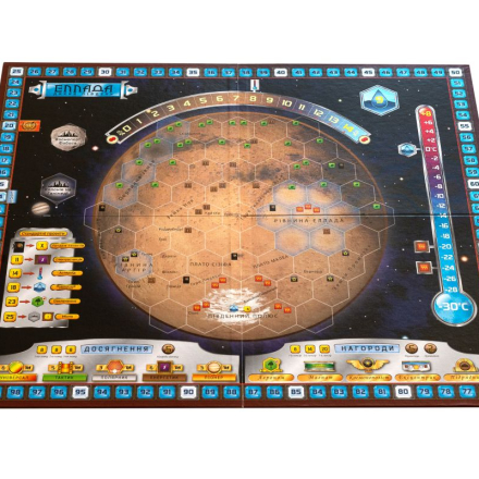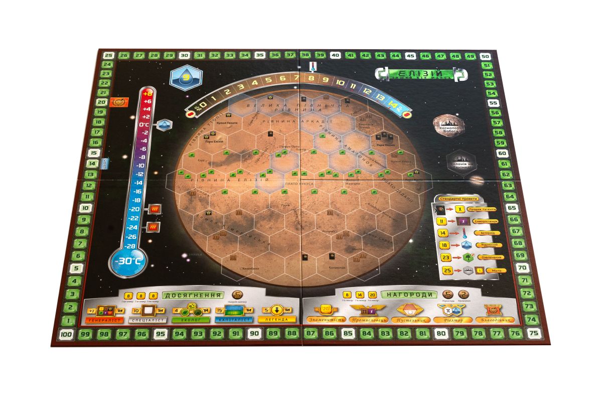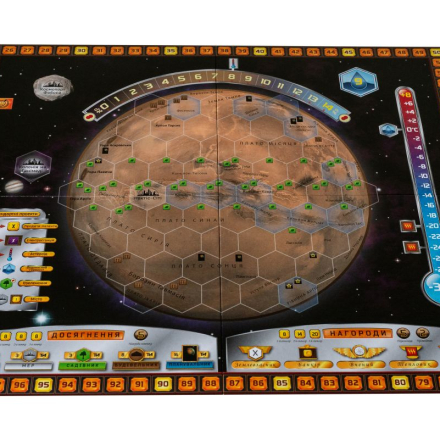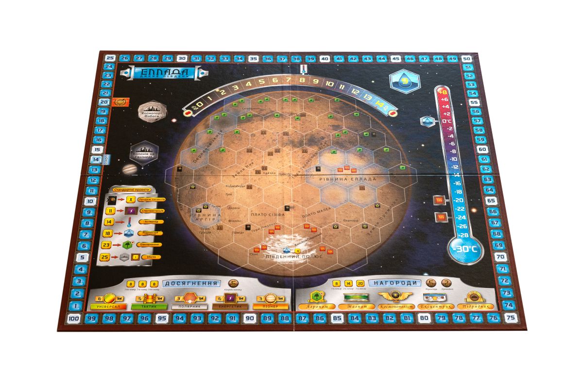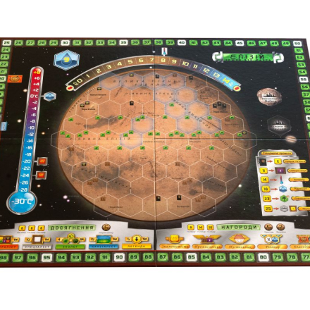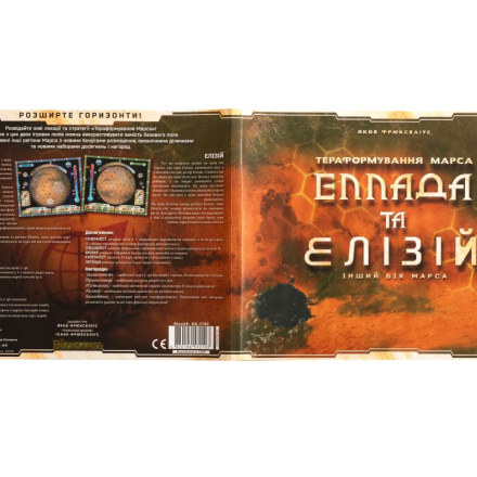 "Terraforming Mars: Hellas & Elysium" - дополнение для настольной игры "Терраформирование Марса". Содержит двухстороннее игровое поле. Каждое из полей можно использовать вместо поля из базовой игры.