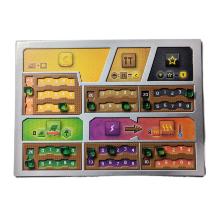 Планшеты изготовлены из двух слоев прочного картона общей толщиной 3 мм. Верхний слой имеет вырезанные углубления для размещения жетонов и кубиков, что надежно фиксирует их в нужном положении. Даже если планшет случайно сдвинется — ресурсы останутся на месте. Усовершенствованный дизайн также учитывает удобное размещение десятков, чтобы не перегружать основное поле и не путаться в учете ресурсов. Планшеты совместимы со всеми версиями игры.