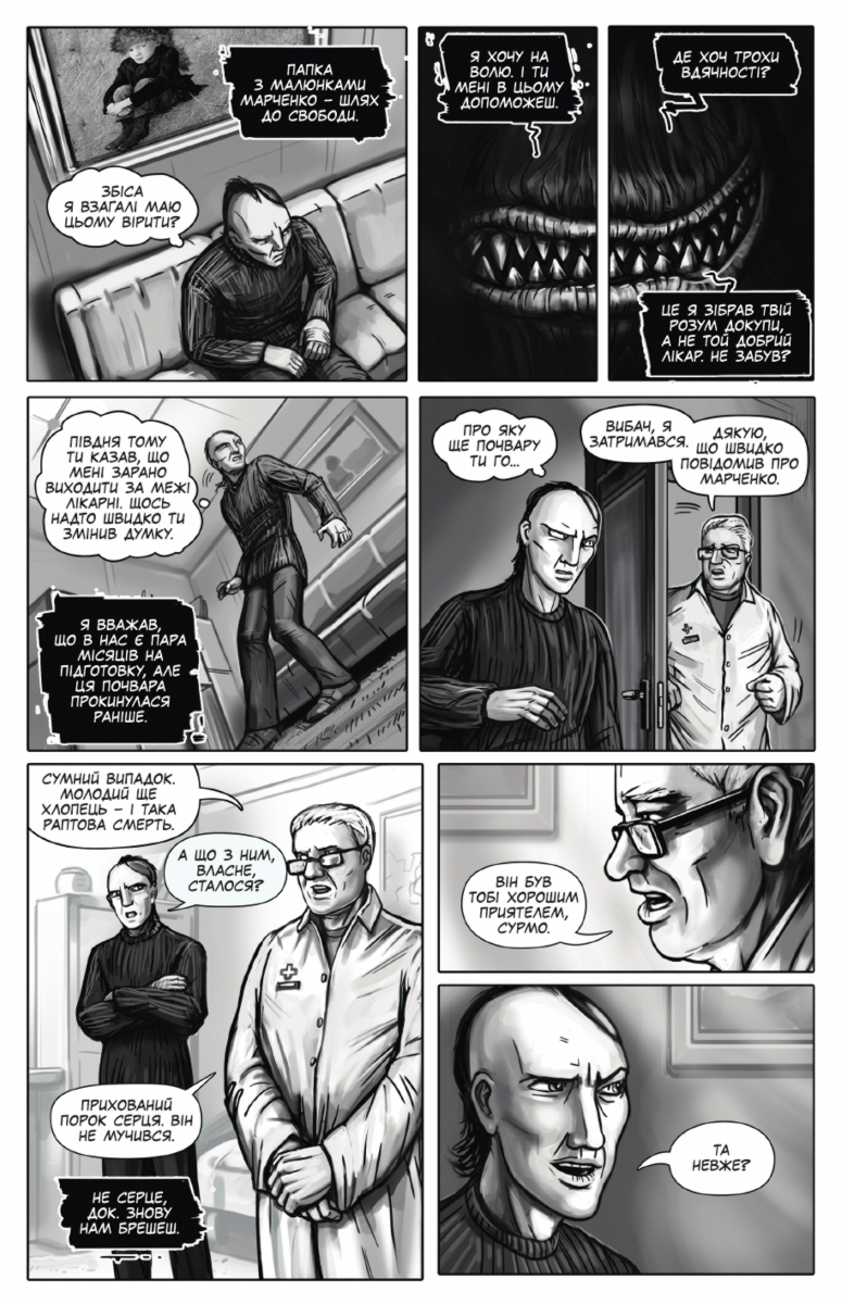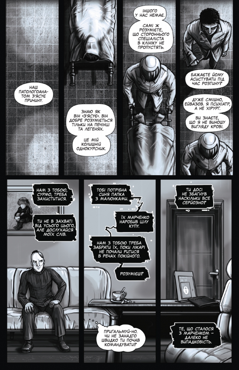 Сюжет – как болото, затягивает читателя очень постепенно, но очень глубоко, и всегда хочется продолжения. Зрительно комикс похож на кадры черно-белого фильма с меткими цветными акцентами, которые вместе с психологическими квестами сюжета создают напряженную атмосферу.