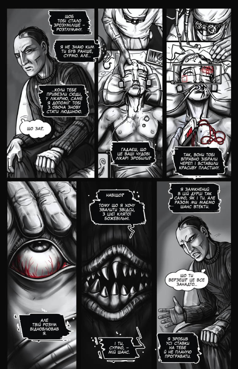 Главный герой Сурма до сих пор в сумасшедшем доме недалекого будущего с железной пластиной на голове. Вокруг него работы-санитары, чудаки и таинственный голос...