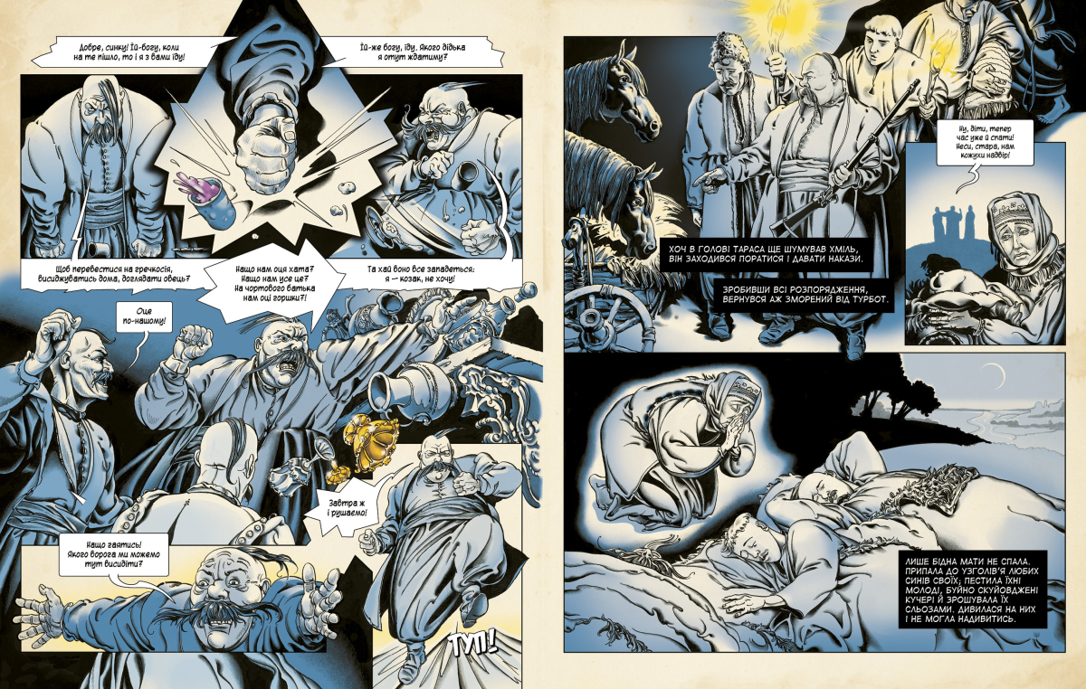 Славный мастер книжной графики Константин Сулима – автор первого украинского комикса «Буйвитер» – создал просто образцовый комикс по классическому роману Николая Гоголя. Кажется, эти рисунки существовали вечно, а текст «Тараса Бульбы» в блестящем переводе Николая Садовского передан с такой тактичностью и достоверностью, на которую, казалось, уже и не приходится надеяться во времена компиляций и дешевых перевираний. Кроме всего, эта книга — еще и идеальный подарок для старшеклассников, ведь фактически весь роман теперь можно прочитать через час...