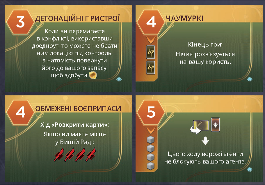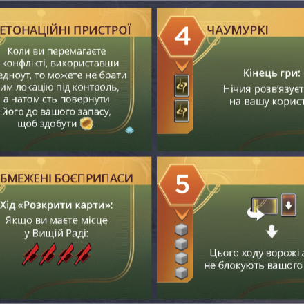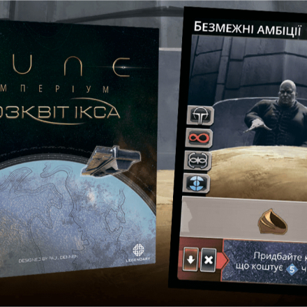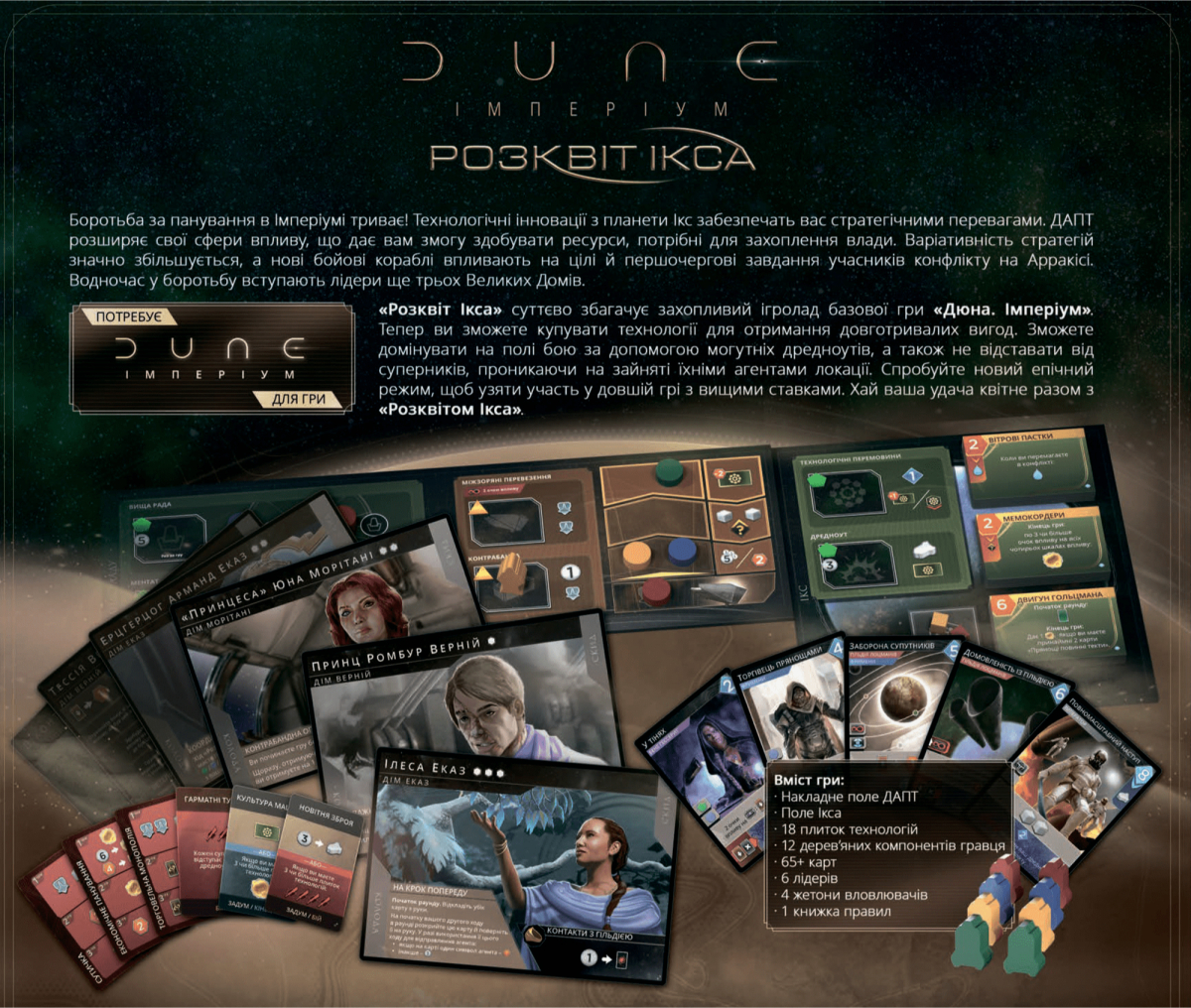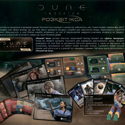 Для соло-режиму та дуельної гри є нові карти дому Гаґал і карти-пам'ятки Конкурентів, а для епічної гри передбачені карти «Контроль над прянощами». Якщо ви награлися в базову гру «Дюна: Імперіум», перепробували всі тактики й стратегії, тоді доповнення «Розквіт Ікса» - те, що вам потрібно!