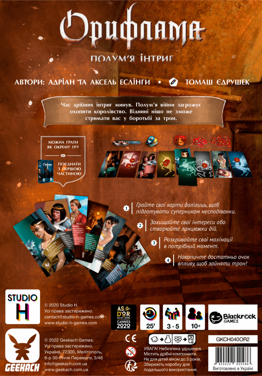 «Oriflamme: Ablaze» - незалежне продовження настільної карткової гри «Орифлама». У нього можна грати окремо від базової гри, а можна об'єднати обидві частини. «Орифлама. Полум'я війни» містить нові карти персонажів та інтриг і пропонує нові механіки підкупу й підміни персонажів. Якщо ви хочете спробувати нові тактики й стратегії та урізноманітнити першу «Орифламу», радимо купити «Oriflamme: Ablaze».