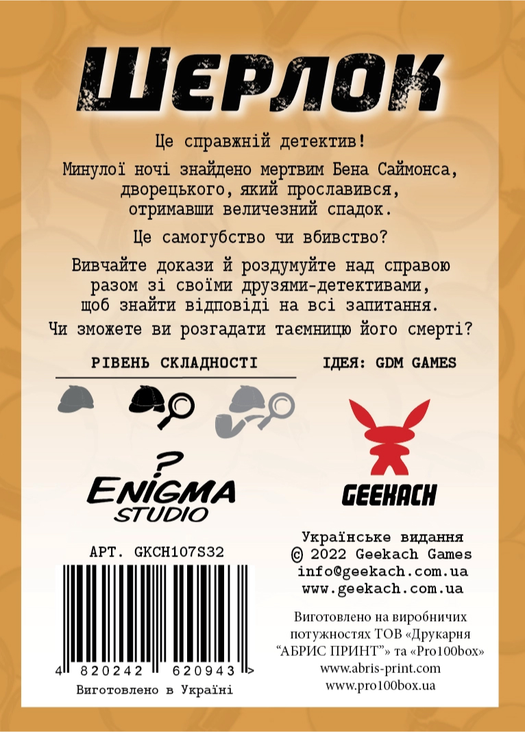 «Sherlock» (також відома як «Елементарно») – популярна серія швидких детективних кооперативів для 1-8 гравців. У 2019 році ця гра стала номінантом престижного конкурсу «Spiel des Jahres» (Гра року в Німеччині). У кожній коробочці гравців чекає окрема справа. Це цікавий детективний філлер, який можна розслідувати соло, з друзями або членами сім’ї. Гра сподобається як новачкам, так і досвідченим гравцям.