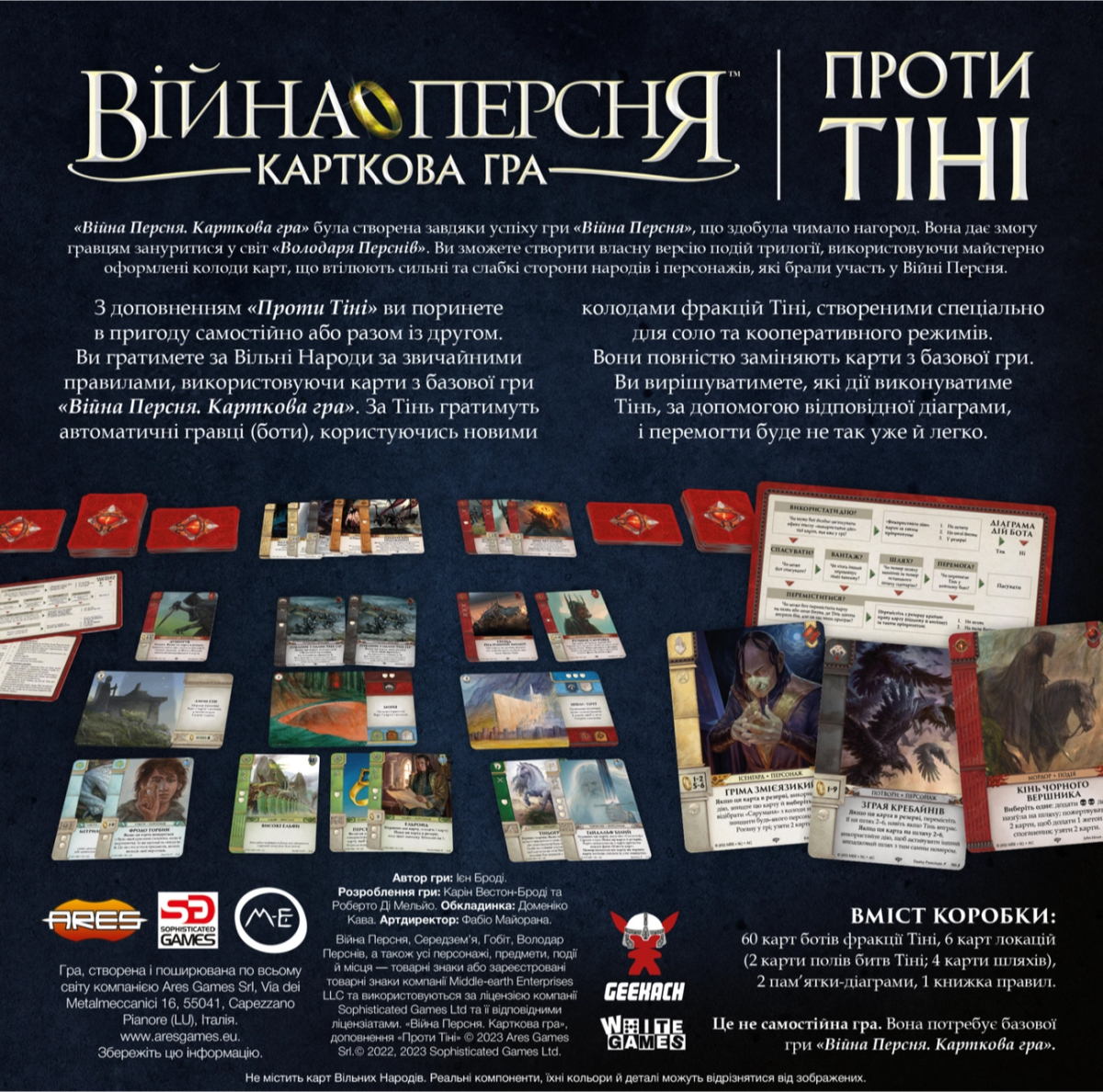 Правила дії бота на стороні Тіні відрізняються від звичних правил гравців. Це доповнення містить дві пам'ятки-діаграми з алгоритмом дій бота, що мають допомогти вам під час перших партій із доповненням «War of the Ring: The Card Game – Against the Shadow».