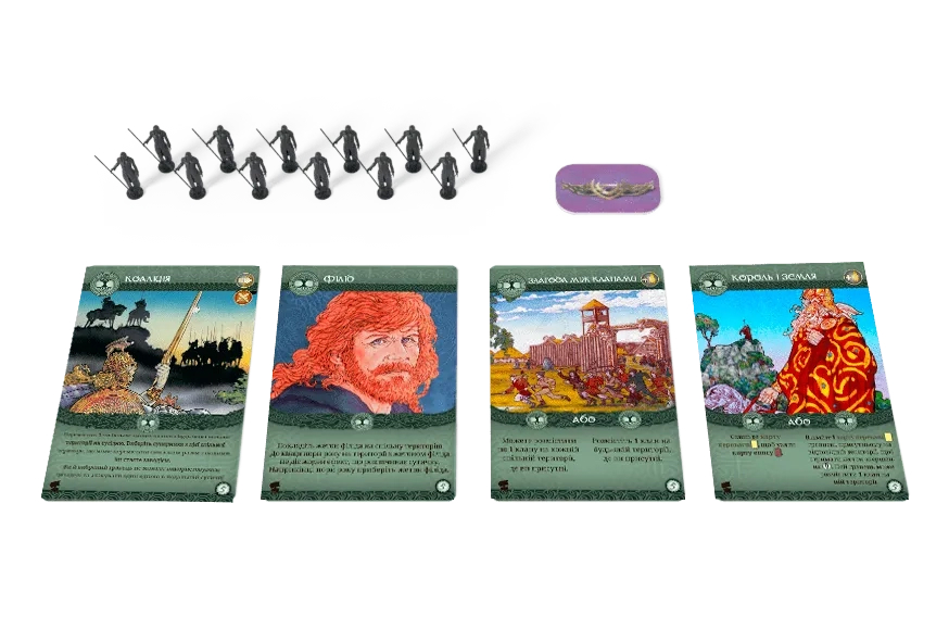 - Король і земля. Віддайте карту переваги гравцеві на тій самій території - й отримаєте жетон подвигу. Або скиньте карту переваги, щоб отримати карту епосу.