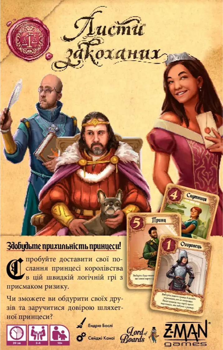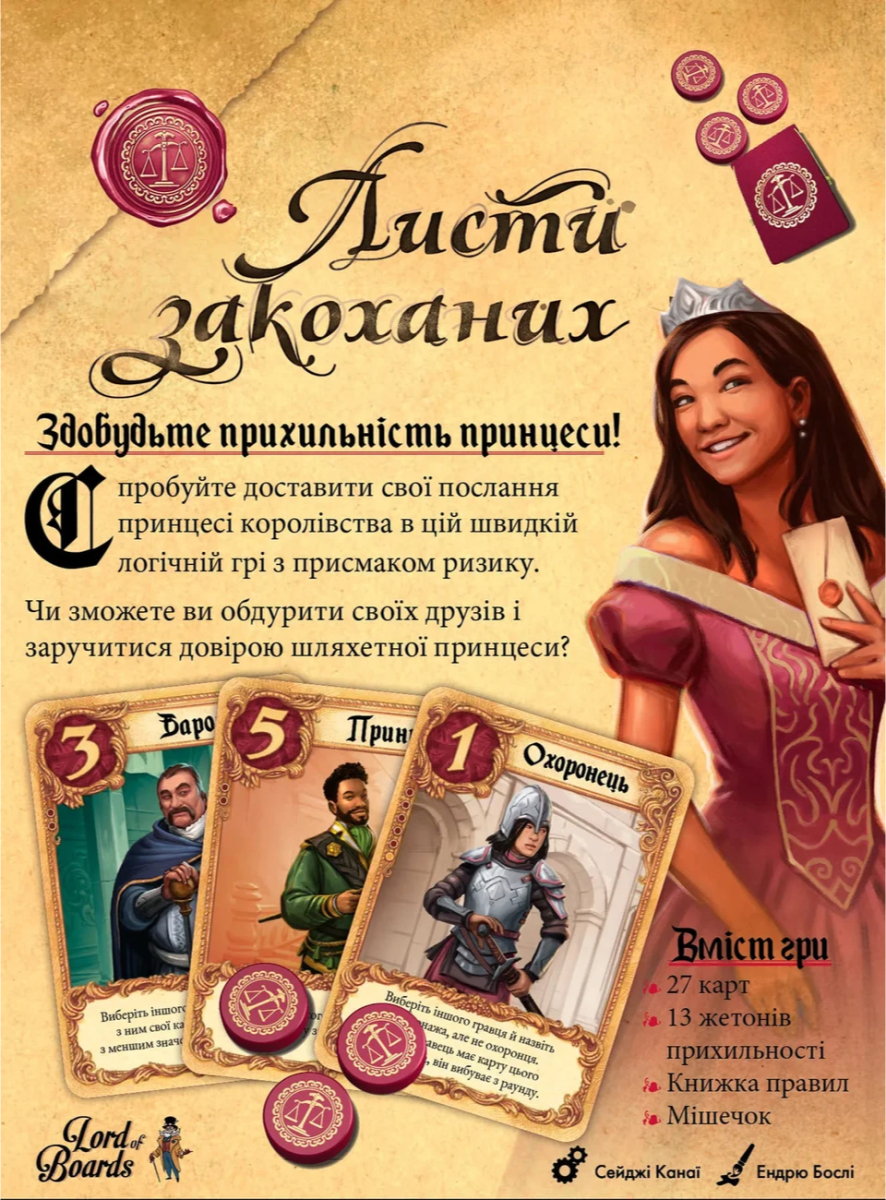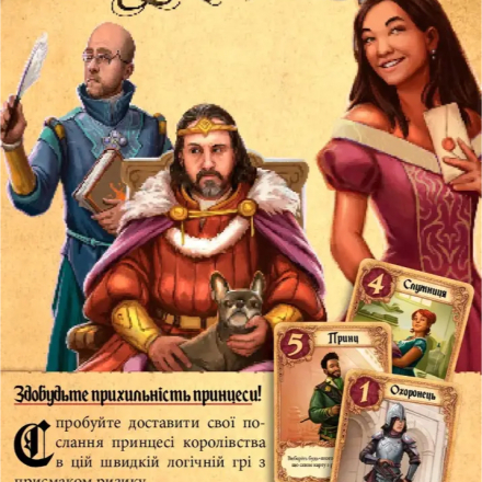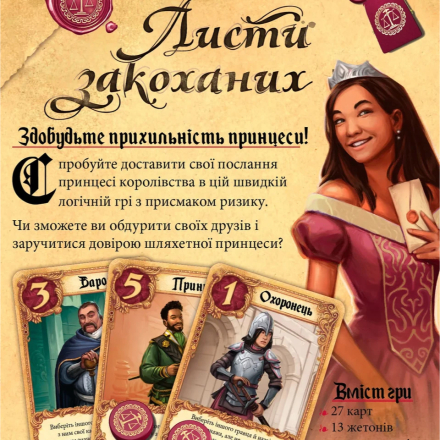 У грі використовується лише шістнадцять карт із зображеннями персонажів, що мешкають в палаці. Число на карі характеризує вплив персонажа - що більший, то більше шансів, що саме цей персонаж принесе перемогу, передавши послання сумній принцесі. На картах персонажів також указані унікальні здібності, які стануть у пригоді під час гри.
