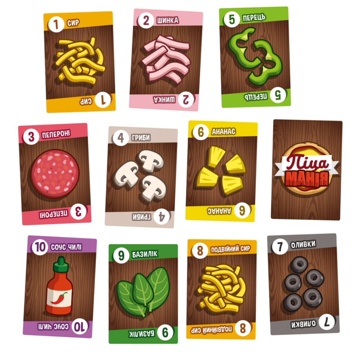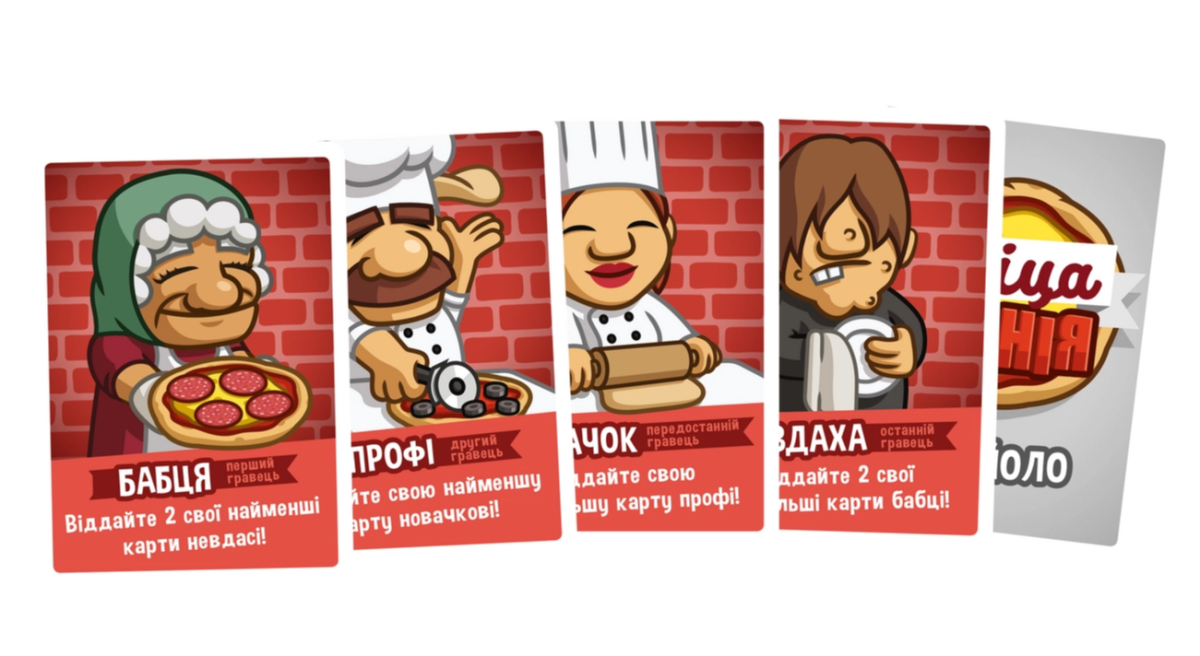 - Колода ділиться на три типи карт: основи для піци, начинка та кухарі. Карти основ та кухарів розміщуються в центрі столу, а карти начинки роздаються гравцям в руки порівну.