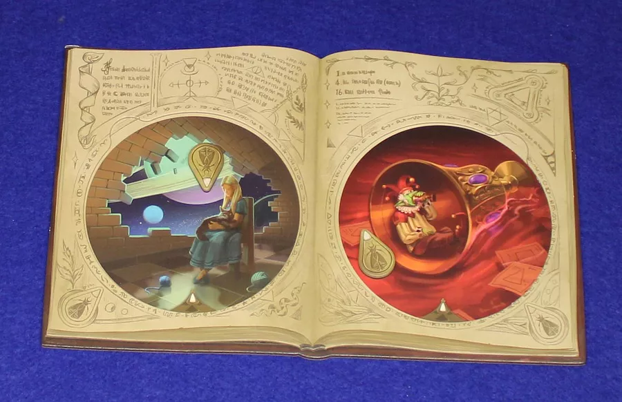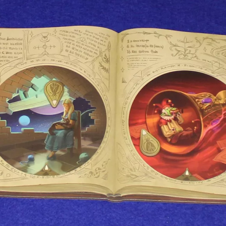 - Гримуар дістає верхню карту з колоди ілюзій і кладе її долілиць біля себе – це карта виходу, яку повинні вгадати Чарівники. Гримуар відкриває ще дві карти ілюзій та кладе їх на планшет книги. За допомогою двох жетонів метеликів він вказує на 1 або 2 елементи на цих картах, щоб натякнути на карту виходу.